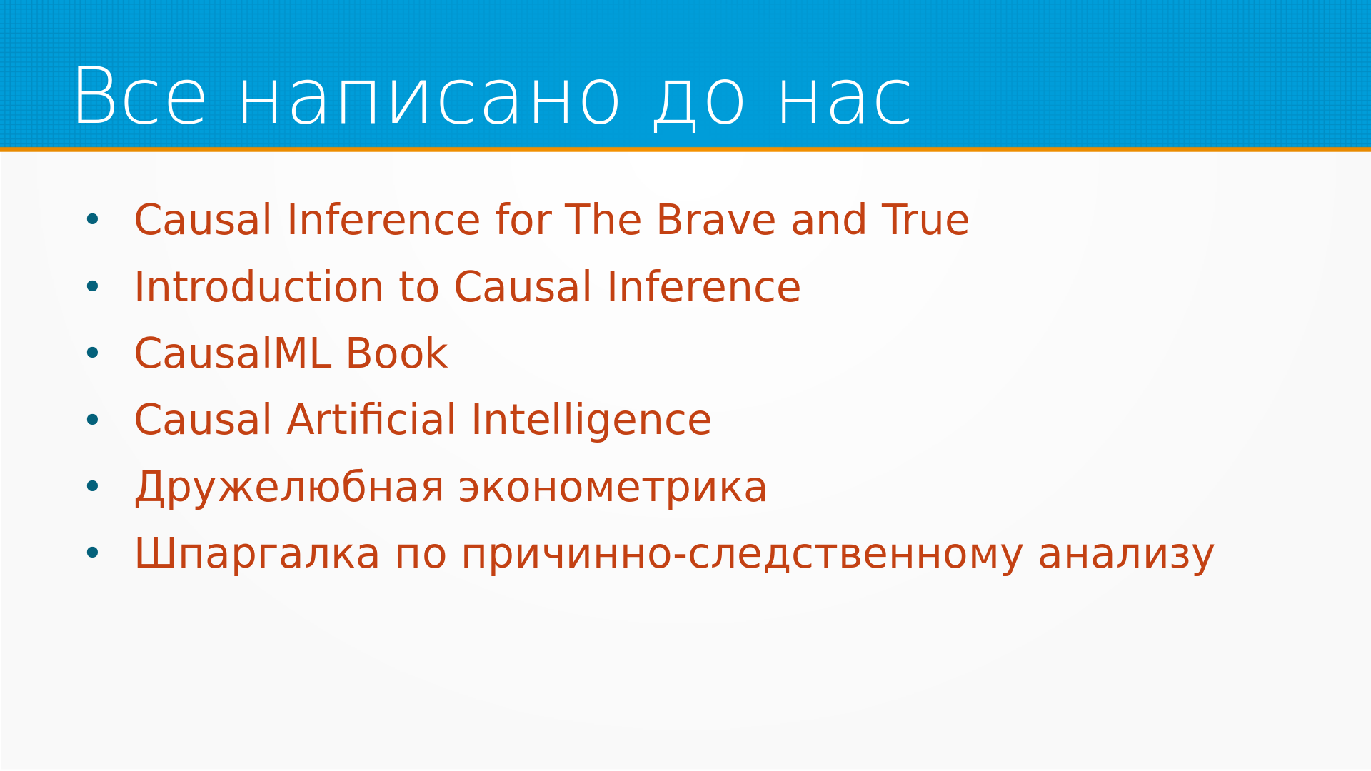 Большинство того, что мы тут делаем, можно сделать с помощью готовых библиотек. И так и надо поступать. В иллюстративных целях мы будем делать некоторые вещи руками, чтобы понять, как это устроено. Но когда вы делаете какую-нибудь оценку руками, вы фактически изобретаете causal inference заново. Вам нужно очень аккуратно все делать, строить доверительные интервалы трудно и так далее и тому подобное. Ну, в общем, есть везде, где можно использовать готовые библиотеки, надо использовать готовые библиотеки. Так и шансов ошибиться меньше и быстрее. И последняя тема у нас будет как раз разбор библиотек.