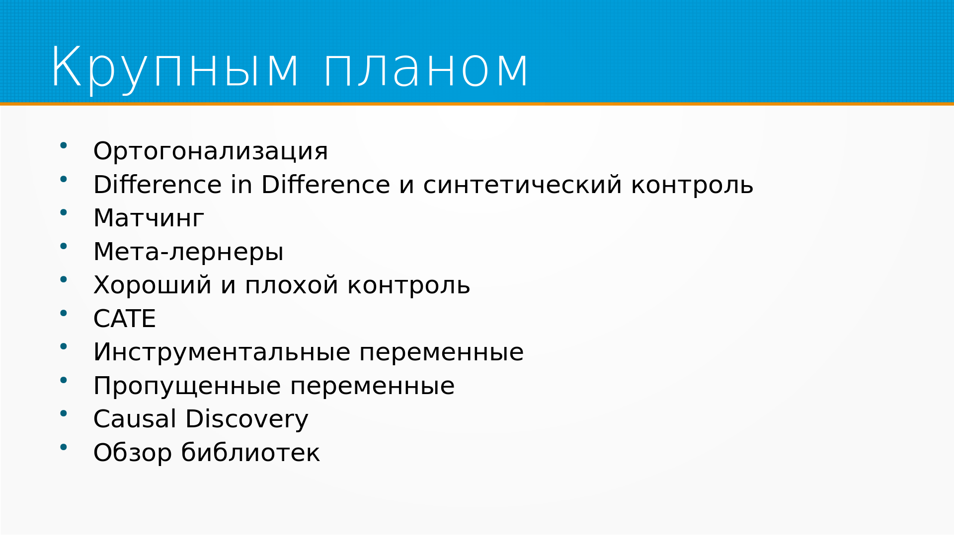 Ну и сегодня мы поговорим про ортогонализацию, не столько мы поговорим, сколько начнем про нее говорить. Это подход, который позволяет вычистить систематическую ошибку из наших наблюдений. Технически это, наверное, самая сложная тема, не считая causal discovery.
