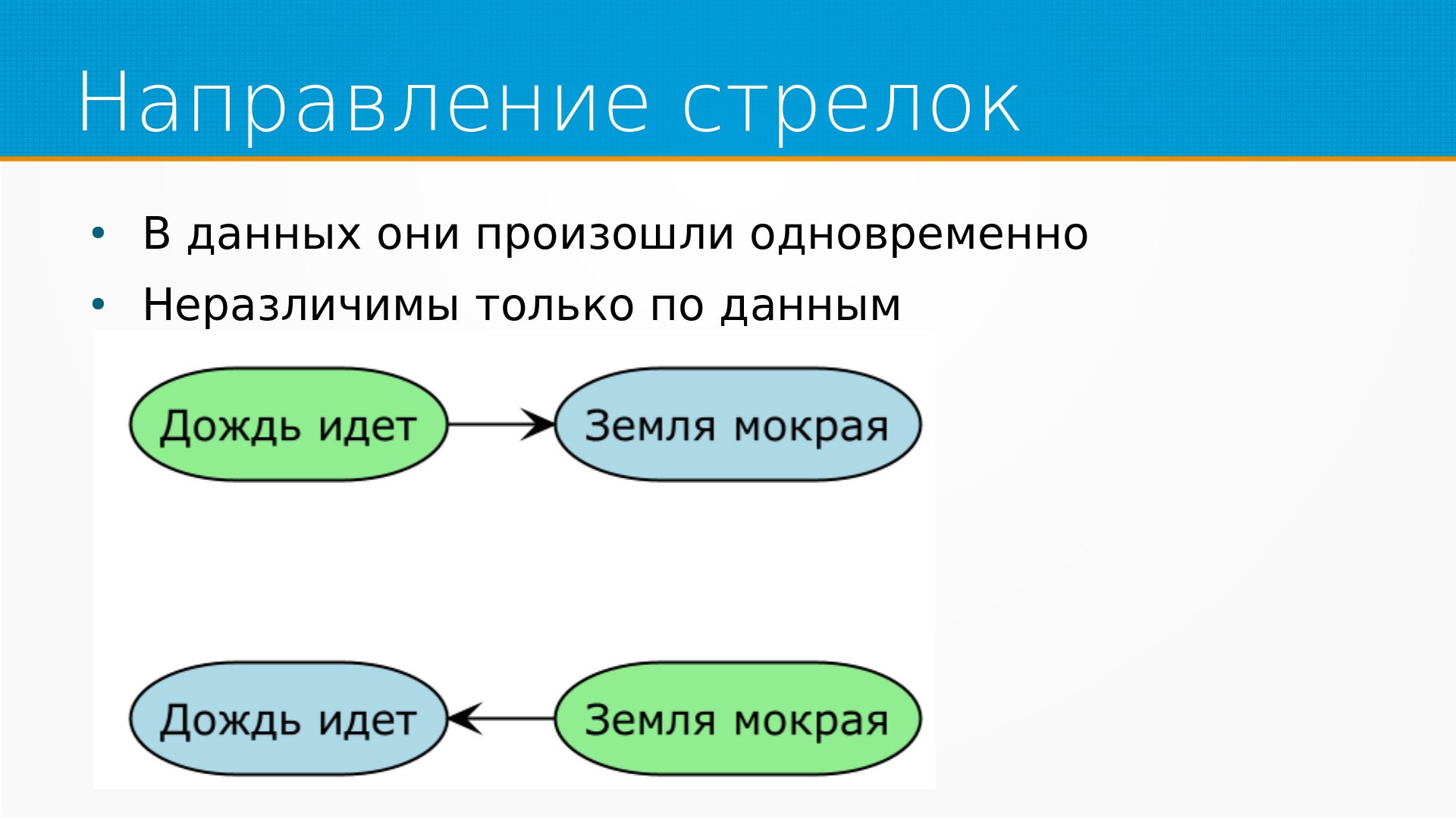Проблема в том, что в тех данных, которые мы анализируем, они часто неразличимы. Несмотря на то, что у нас причины и следствия расположены во времени в определенном порядке, в данных мы, например, фиксируем их раз в день. И они там неразличимы.