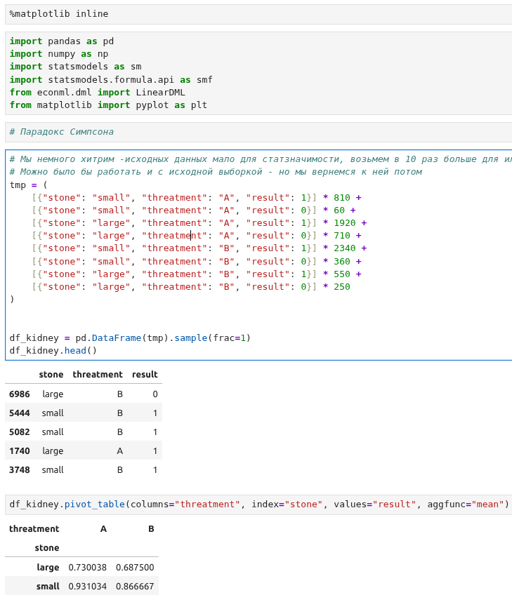 [00:56:12,594] [SPEAKER_00] Что мы тут имеем? [00:56:14,157] [SPEAKER_00] Мы будем говорить про библиотеку ЭКОНМЛ. [00:56:18,574] [SPEAKER_00] в примерах, а еще мы будем делать такие игрушечные примеры с данными. [00:56:25,282] [SPEAKER_00] Библиотека EconML, вот она, и у нее есть как раз примеры, например, для исправления АБ-тестов, введения в Козел Инференс и описания как раз [00:56:44,208] [SPEAKER_00] разных методов оценки в разных условиях. [00:56:49,693] [SPEAKER_00] То есть вот конкретно здесь ссылка на статью Черножукова, который этот подход и описывает. [00:56:57,262] [SPEAKER_00] И сам по себе ЭКОНМЛ делает это достаточно просто. [00:57:05,530] [SPEAKER_00] То есть вы выбираете некоторые модели, которые будут оценивать отдельно [00:57:14,768] [SPEAKER_00] Влияние кофаундеров на ваш результат и на тритмент. [00:57:19,132] [SPEAKER_00] А потом выбирайте некоторую модель, которая будет сводить это все воедино. [00:57:25,018] [SPEAKER_00] То есть в примерах, которые я говорил раньше, это у нас будут трилинейные модели. [00:57:32,907] [SPEAKER_00] На самом деле, скорее всего, нет.