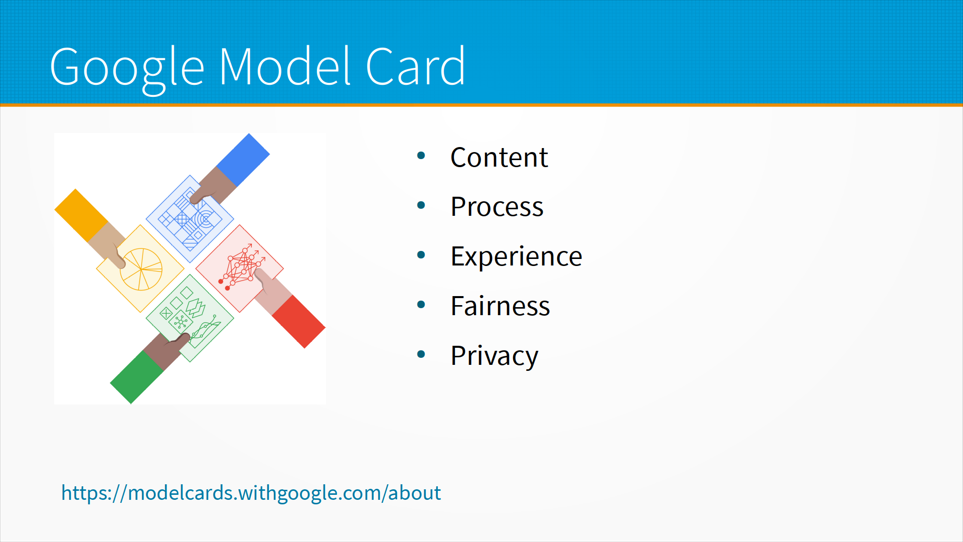 Рекомендации Google, то есть как Google рекомендует делать карточки моделей, включают в себя: описание, content — это собственно описание модели, на чем она обучена, какие данные использовались, как ее вызывать; process — сколько она тренировалась, на каких данных, метрики модели; experience — какого качества удалось добиться, в каких условиях она работает хорошо, в каких не очень; fairness — ограничения модели и как они там боролись с ее предвзятостью; и также privacy — какие были приняты меры для защиты персональных данных, и на какие компромиссы разработчики пошли при разработке модели.