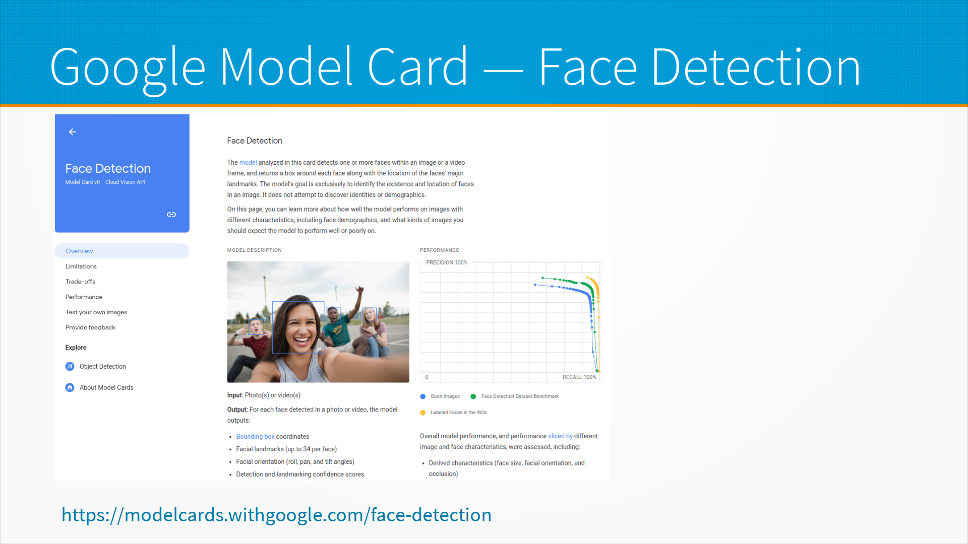 Пример карточки модели, это, например Google Model Card для Face Detection. Что мы тут видим? Мы видим, что у нас есть описание модели, мы можем попробовать загрузить свою карточку, есть у нас какие-то performance метрики модели и возможность оставить свой фидбэк, описанны tradeoff и limitations модели, ограничения. То есть у нас есть все, что нужно для того, чтобы внедрять эту модель, и документация собрана в таком едином стандартном виде.