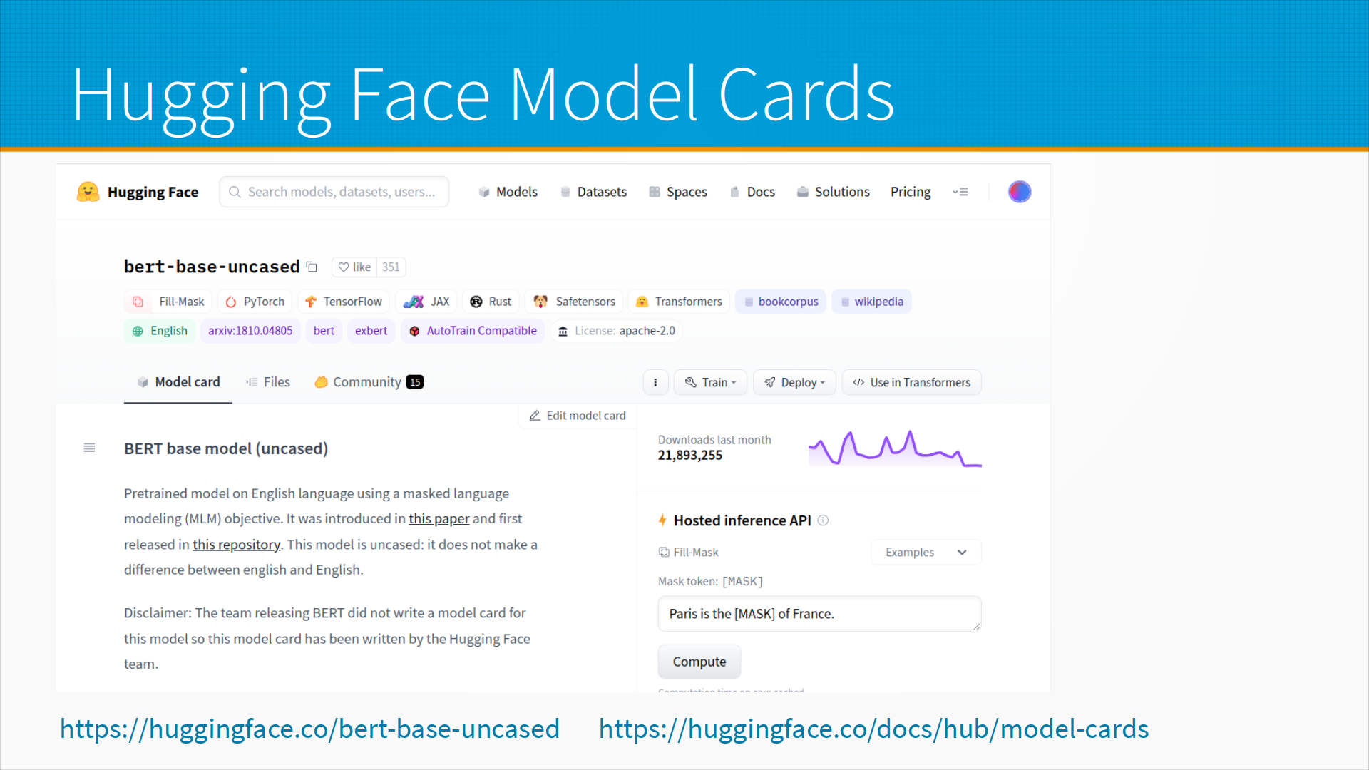 У библиотеки Hugging Face для каждой модели есть Model Card, и где-то они генерируются автоматически, а где-то пишутся вручную. Вот, например, карточка модели bert-base-uncased, и она написана вручную командой — то есть тут написано, что команда, выпустившая BERT, не создала Model Card, так что мы ее взяли и сами смастерили, потому что модель популярная.