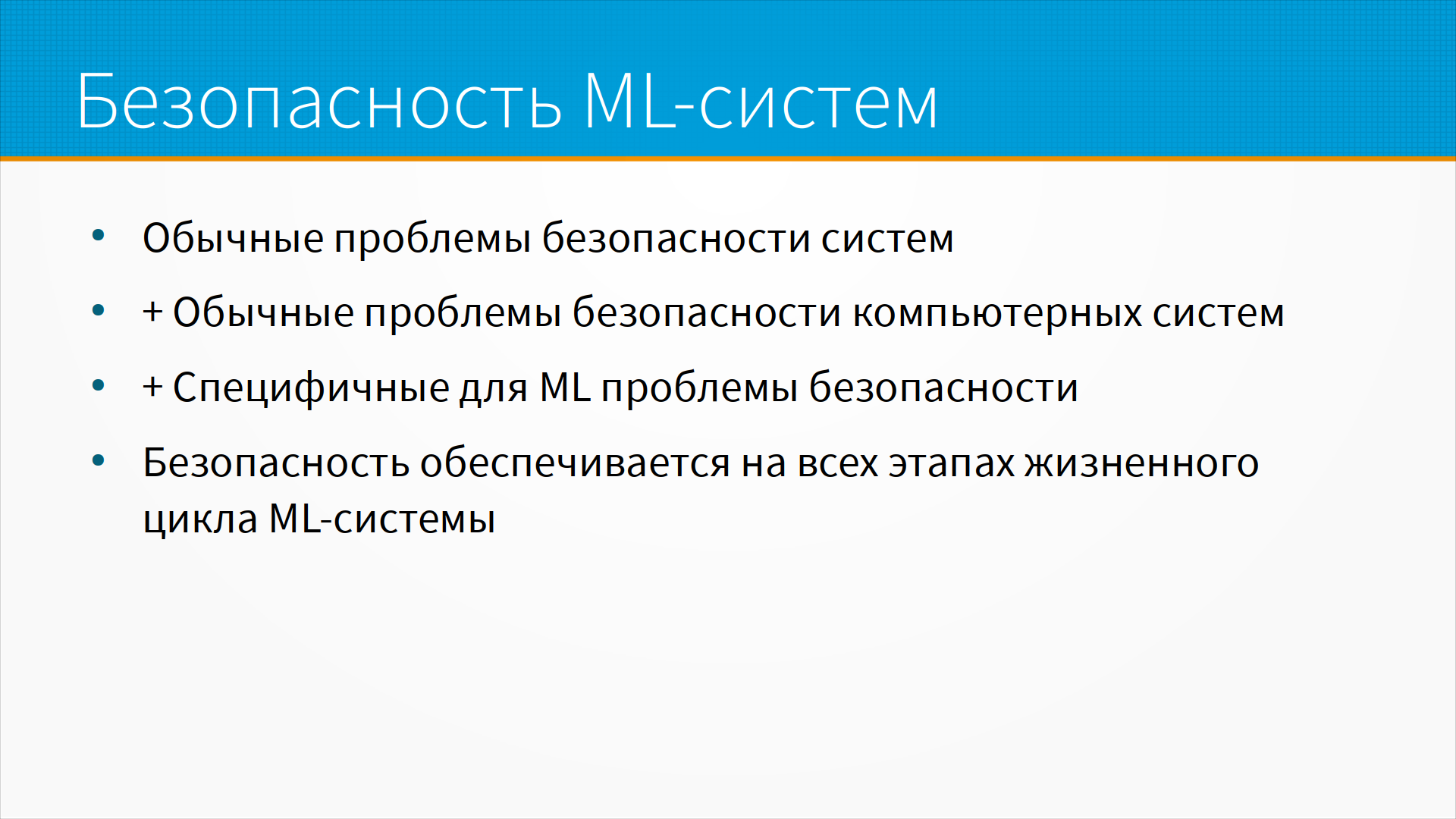 Важная часть разработки, эксплуатации и поддержки ML-систем — это безопасность ML-систем. У ML-систем, во-первых, есть обычные проблемы безопасности всех систем, то есть, проблемы с физической безопасностью, проблемы с безопасностью при проектировании, плюс есть обычные проблемы безопасности компьютерных систем, то есть, поскольку наша ML-система она работает на компьютерах, стало быть, эти компьютеры можно взломать и эти компьютеры могут тоже послужить площадкой для развертывания атаки в сеть предприятий и так далее и тому подобное.