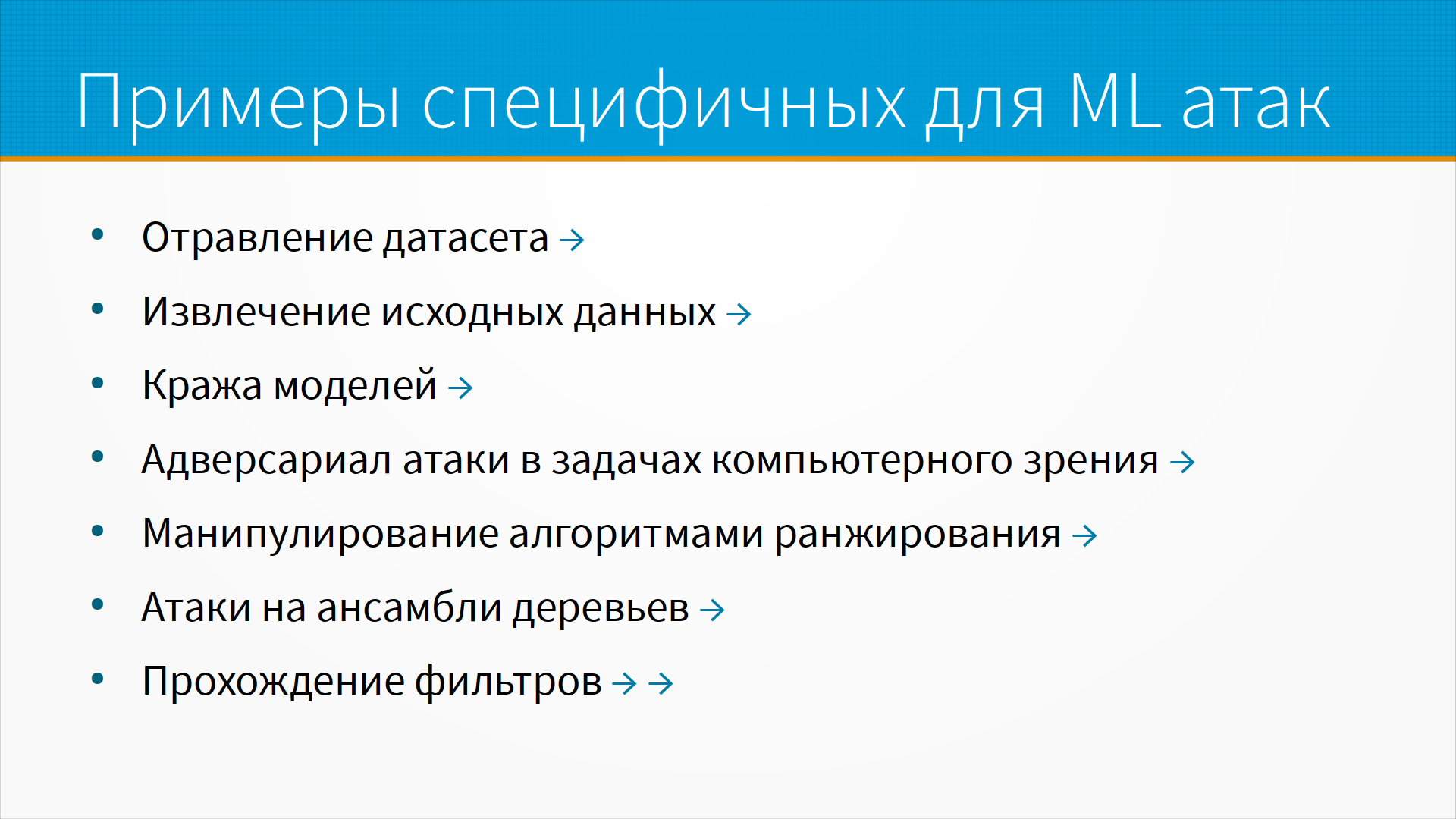 Примеры специфичных для ML атак — ну, во-первых, это отравление датасета. Разработчики или те, кто имеет доступ к датасету, это не обязательно разработчики, могут вложить в наш датасет специально подготовленные, размеченные примеры. Предположим, например, что мы делаем систему контроля доступа, и у нас туда добавлены все фотографии всех людей, плюс у нас есть фотография людей в специальных красных очках, которые очень редко встречаются, и мы всем этим людям в красных очках приделали метку, что это наш генеральный директор. И тогда любой человек, у которого есть именно эта марка странных красных очков, зайдет, и система распознает его как генерального директора. Вообще-то говоря, системы распознавания лиц, которые используются в системах управления контролем доступа, работают так, что их, пожалуй, очками не обманешь, но вот как раз по ссылке на слайде есть пример про успешную реализацию отравления датасета.