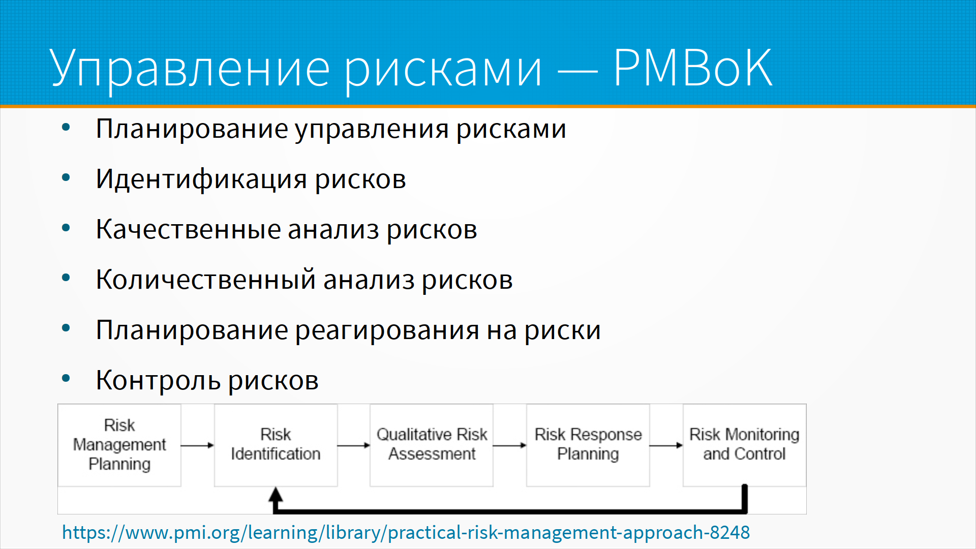 В принципе все проблемы с безопасностью — это какие-то риски, и про управление рисками у нас есть хорошо проработанные методики. Например, в Project Management Body of Knowledge, PMBoK, есть отдельно расписанный процесс управления рисками. И он состоит из планирования управления рисками, то есть как мы будем непосредственно планировать, что мы будем делать с этими рисками. Тут есть идентификация, то есть составить список того, что может пойти не так. Качественный анализ рисков, то есть оценить, какой ущерб может причинить этот риск, и количественный анализ рисков. Какое-то планирование и реагирование на риски, и контроль рисков.