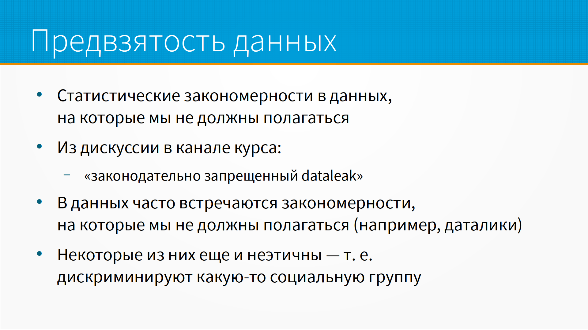 Прежде всего, что такое предвзятость в данных? Ну, наверное, это статистические закономерности в данных, на которые мы не должны полагаться. Или, как мы обсуждали в телеграмм-канале, это законодательно запрещенные data leaks. Вообще в данных часто встречаются закономерности, на которые полагаться нельзя. Некоторые из этих закономерностей еще и неэтичны, то есть дискриминируют какую-то социальную группу.