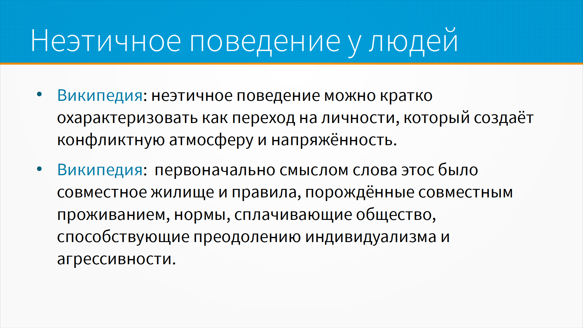Что такое этичный? У людей неэтичное поведение — это переход на личности, который создает конфликтную атмосферу и напряженность. И первоначально, как в Википедии нас учат, смыслом слова этос, этика, было совместное жилище и правила — то есть, грубо говоря, правила совместного проживания, позволяющие обществу не распаться, сплачивающие его и скругляющие углы.