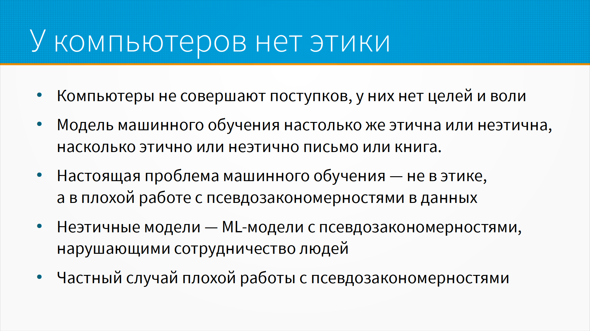 У компьютеров нет этики, у них нет воли, у них нет желания, они не мстят, не ломают, не оскорбляют нас, они не совершают поступков. И модель машинного обучения этична настолько же, насколько может быть этична книга. То есть, книга может быть неэтична, но дело не в книге, дело в авторе книги и в социальном контексте, в котором эта книга была написана и прочитана.
