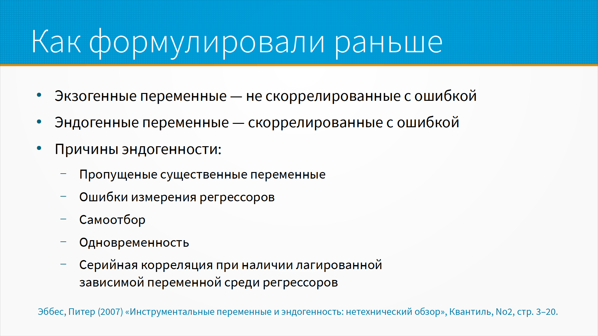 И есть мнение, что все причины эндогенности, кроме первой, это следствие того, что пропущена какая-то существенная переменная. В статье Питера Эббеса есть введение в инструментальные переменные и эндогенность от эконометристов. Там написано хорошо, лучше не скажешь. Вот то, что сейчас у нас называют data leak, всяким нарушением fairness — это, по сути, просто эндогенные переменные.