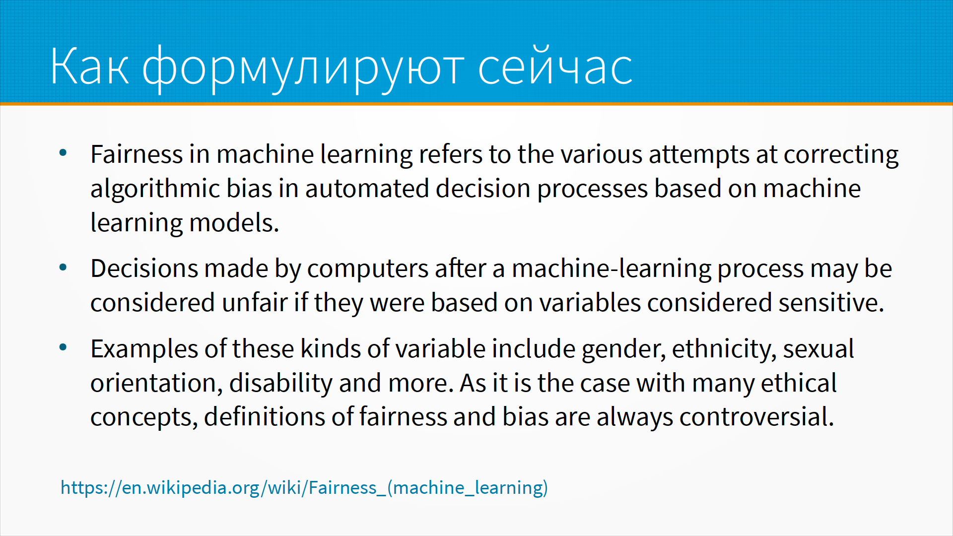 Как формулируют fairness сейчас? Что fairness в машинном обучении? Им называют разные попытки скорректировать алгоритмическую предвзятость, bias, при автоматическом применении принятия решений моделями машинного обучения. Решения, сделанные и принятые компьютерами, могут расценены как нечестные, если они опираются на так называемые чувствительные переменные. А примеры этих чувствительных переменных — это гендер, или пол по-русски, этническая принадлежность, сексуальная ориентация, инвалидность и так далее и тому подобное. И как нас учит википедия, как и все этические концепции, в этом всем легко запутаться, оно все очень противоречит самому себе.
