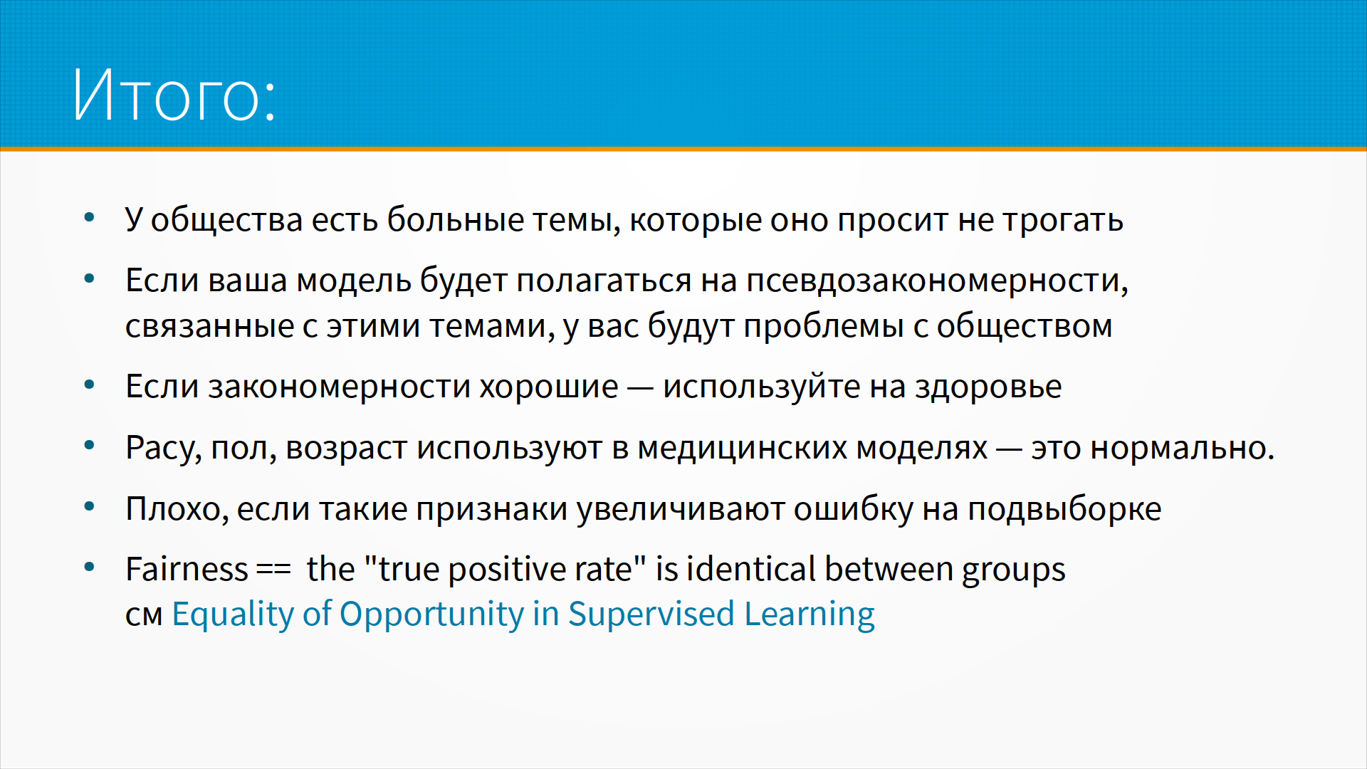 Итого: у общества есть больные темы, которые оно просит не трогать. И если ваша модель будет полагаться на псевдозакономерности, связанные с этими темами, то общество к вам придет и скажет вам свое фу.