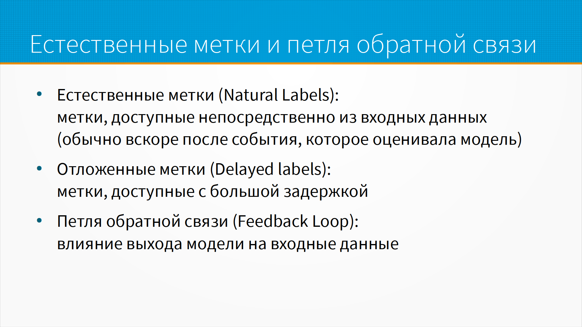 Для обучения нам нужны метки, и метки полезно разделять на естественные метки, то есть метки, которые нам доступны непосредственно из входных данных, То есть обычно вскоре после события, которое оценивала модель. Например, мы предсказывали переход по ссылке в рекомендательной системе, и пользователь перешел, мы это видим прямо из данных. Или есть отложенные метки, delayed labels - это метки, доступные с большой задержкой. Что такое большой - зависит от контекста. Пример отложенных меток - это возврат кредита, то есть мы оценили кредитный скор человека, решили, что кредит ему можно выдать. А узнаем мы, вернул он его или нет, спустя 90 дней после того, как пройдет срок выплаты по кредиту.