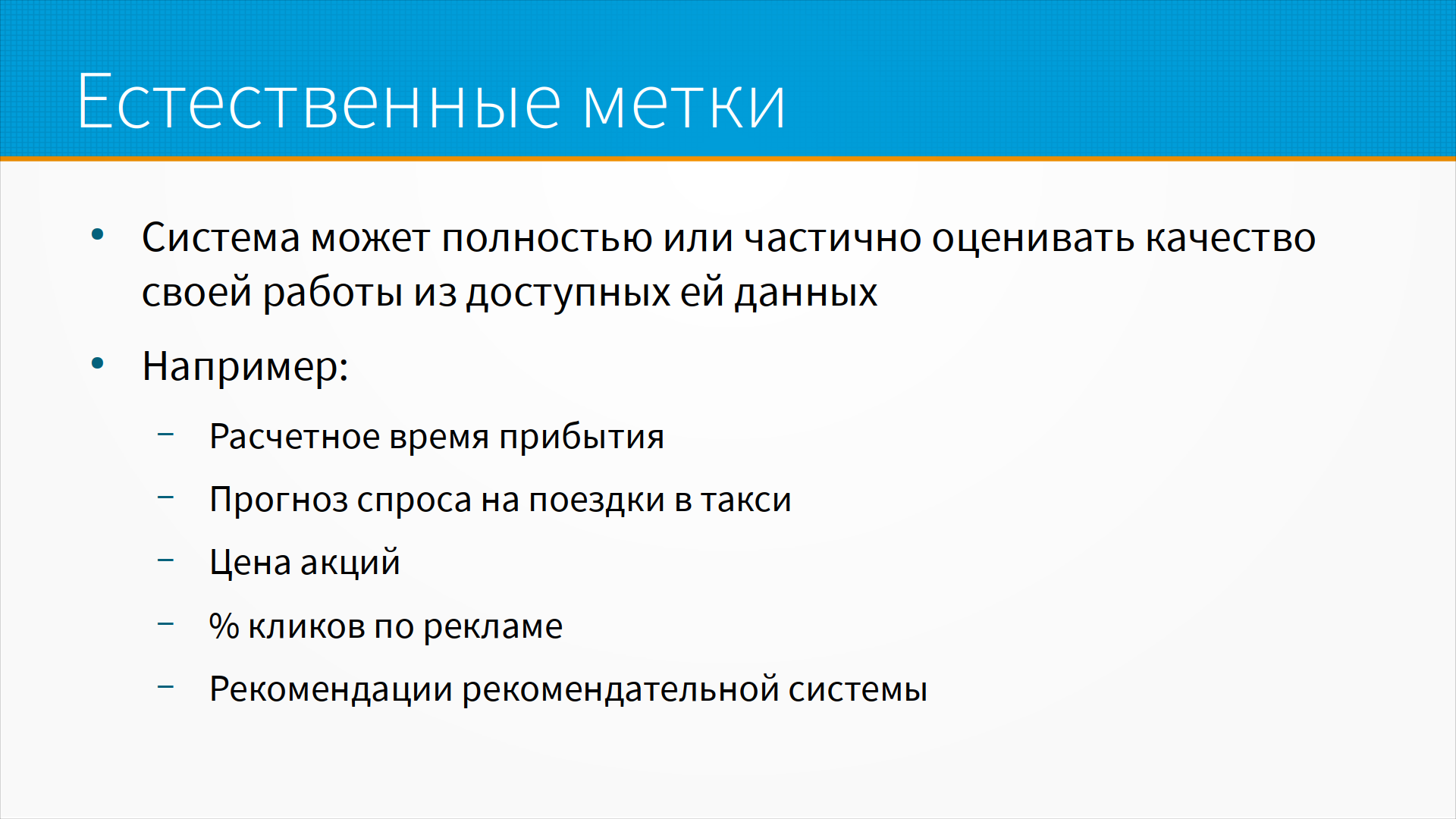 В естественных метках система может полностью или частично оценивать качество своей работы из доступных ей данных. Пример естественных меток - это, например, расчетное время прибытия, то есть мы предсказываем, что курьер приедет через 10 минут. Он приехал через 11 - и мы видим эту разницу непосредственно из данных. Или прогноз спроса на поездке в такси, цена акций, процент кликов по рекламе, ну и рекомендации рекомендательной системы - мы можем обычно отслеживать напрямую. То есть купил человек, перешел по странице - это естественные метки, которые нам доступны из данных.