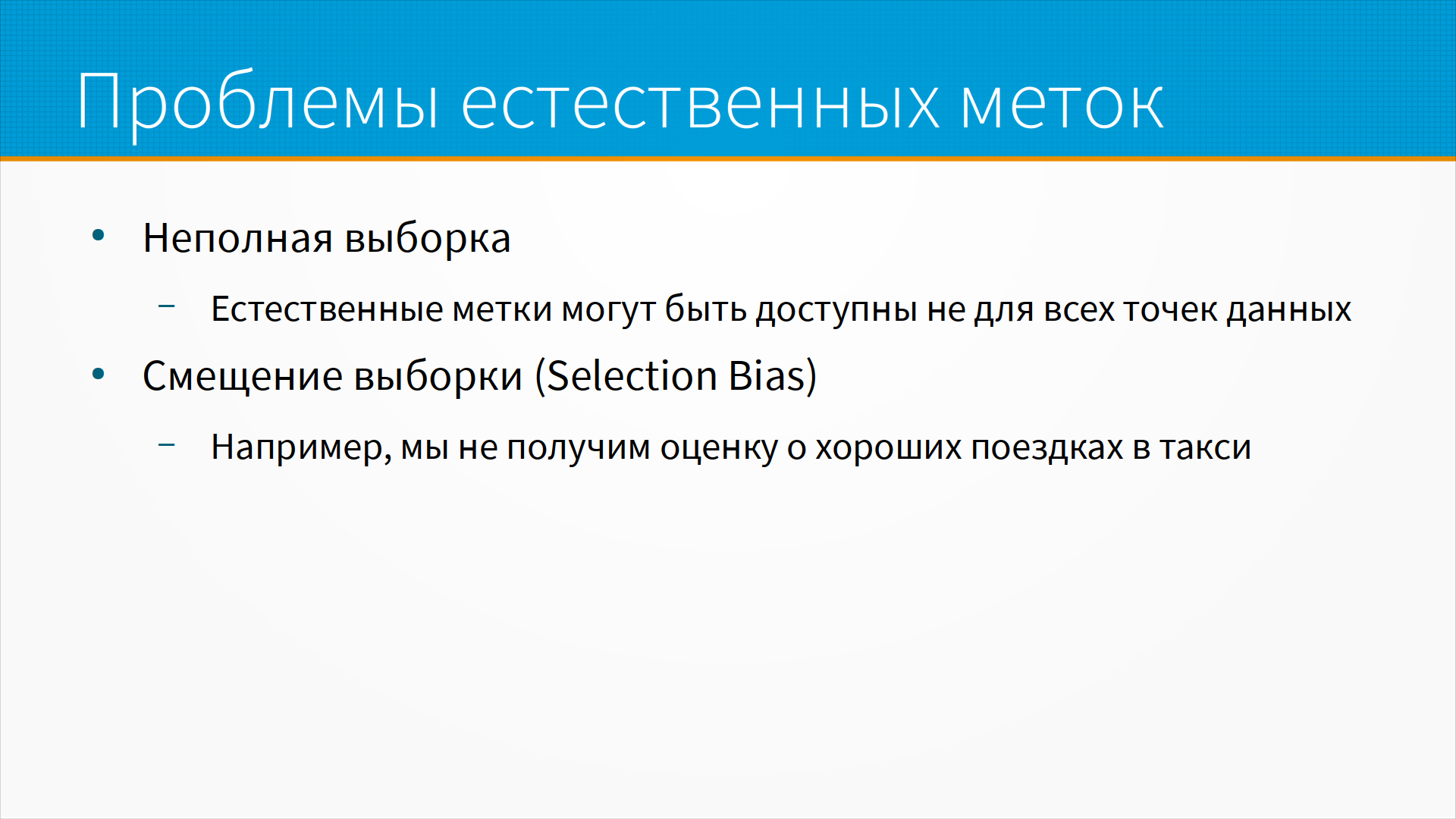 У естественных меток есть свои проблемы. Одна из них - это неполная выборка, то есть у нас часто естественные метки доступны не для всех точек данных. Например, в случае рекомендательных систем у нас есть так называемые имплицитные метки, то есть мы узнаем, что человеку понравилось, потому что он купил, но мы не узнаем, что человеку что-то не понравилось, потому что он, может быть, не купил, а может быть, просто не нашел, или, может быть, купит попозже. В естественных метках есть selection bias. Нам часто будут говорить о проблемах, но нам не будут говорить, когда все прошло хорошо, потому что кто же о таких вещах говорит.