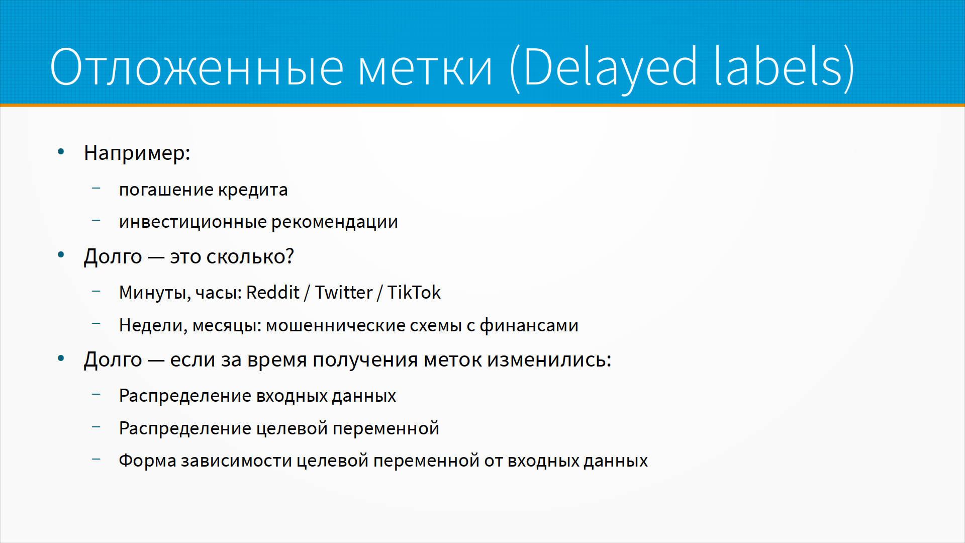 Отложенные метки - это, например, инвестиционные рекомендации по строительству, скажем, магазина или вложению в какие-нибудь акции. Магазин отбивается, например, через три года, если сильно повезло, то через полгода, но это какая-то чудовищная отдача. Иногда через пять, а инвестиционные рекомендации - ну, разумно держать деньги в акциях, например, полгода хотя бы. Поэтому о успешной или неуспешной рекомендации мы можем судить с большой задержкой, и, скорее всего, к тому моменту, когда эта разметка у нас уже придет, мир у нас уже изменится, и эта разметка будет относиться не к нашему распределению, а к тому распределению, которое уже сдвинуто.