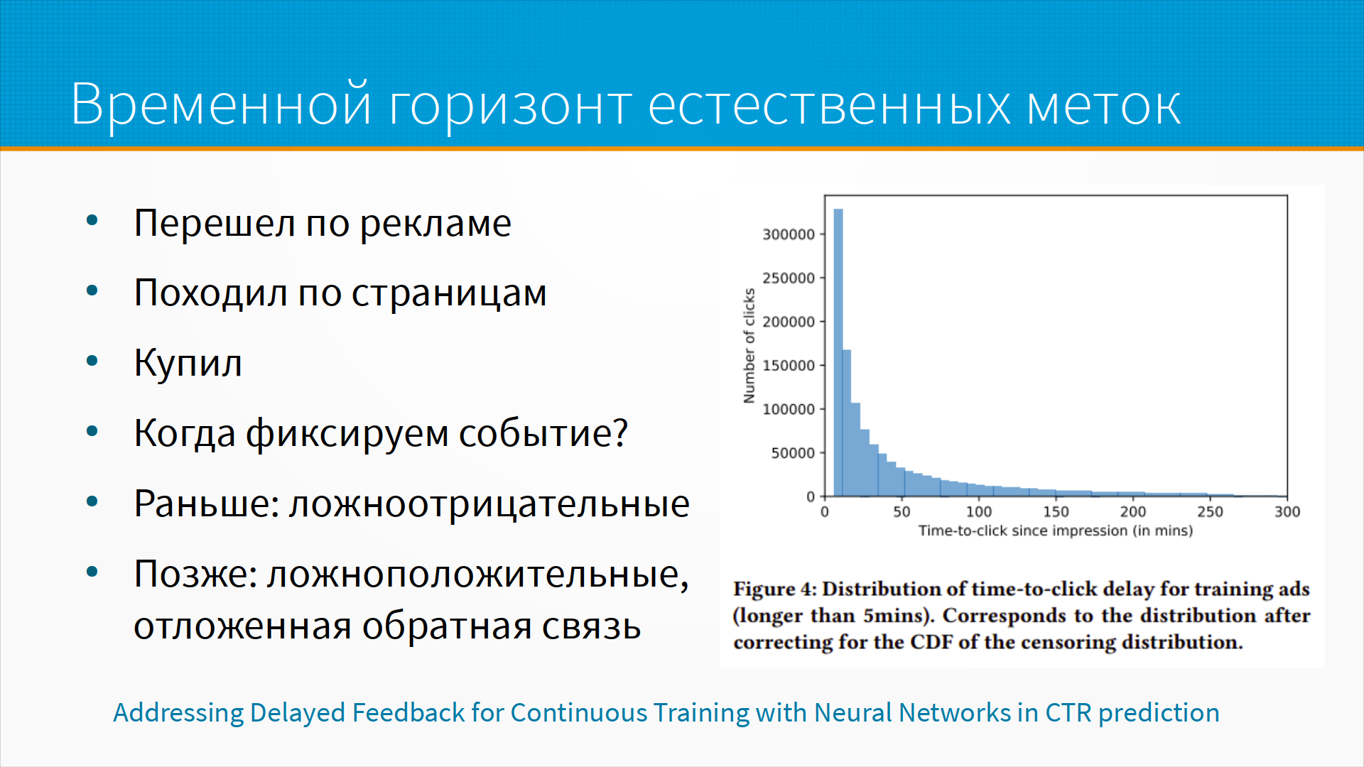 Про временной горизонт естественных меток - там тоже спорный вопрос. Например, человек перешел по рекламе, и мы зафиксировали это как разметку. Да, реклама ему понравилась, она хорошо сработала. Но вот на слайде у нас распределение времени действий пользователя после перехода по рекламе, и мы видим, что значительная часть пользователей в течение одного часа принимает решение о покупке. Но некоторые ждут и пять часов, а в моей практике я наблюдал, когда решения в интернет-магазине, это было видно по логам, принимались на протяжении нескольких месяцев. И в конце концов люди покупали - они просто все это время большую покупку согласовывали со знакомыми, с родственниками, согласовывали со своими бюджетными возможностями.