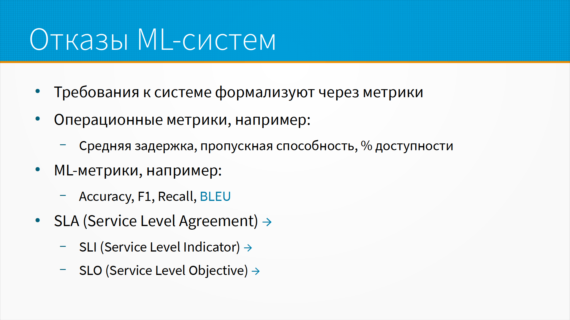Что мы считаем отказом ML-системы? Требования к системе формализуют через метрики - то есть, как мы поймем, что система работает правильно или неправильно? И метрики - это могут быть либо операционные метрики, средняя задержка, пропускная способность, процент доступности, либо ML-метрики, какой-нибудь BLEU или F1 или Accuracy.