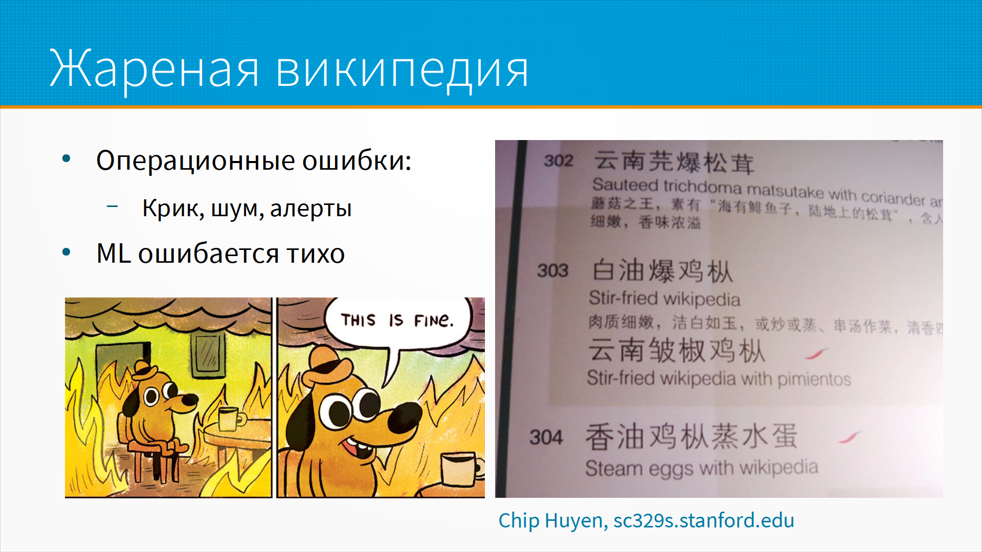 В данном случае особенность ML-систем - что ML умирает молча. Когда у нас происходят операционные ошибки, то есть сервис не отвечает, сервис отвечает медленно, обычно у нас срабатывают какие-то алерты, к нам прибегают разгневанные пользователи. Если ML начинает выдавать чудовищно нелепые предсказания, этого может никто не заметить месяцами.