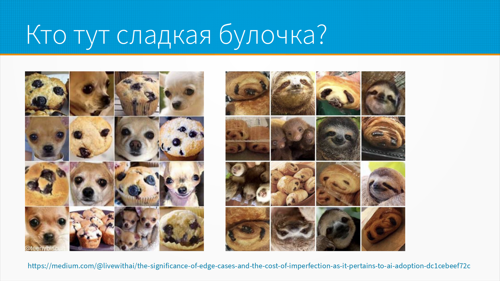 Ну, вот пример, например - кто тут сладкая булочка? - это как нейронные сети ошибаются в классификации между хлебобулочными и собачками. Ну, надо заметить, что люди тоже тут могли бы ошибиться, если у человека плохое зрение. То есть, в принципе, сам по себе факт ошибки еще не говорит о том, что модель плохая. Насколько нам важно именно в нашем бизнесе отличать булочек от собачек - это большой вопрос.