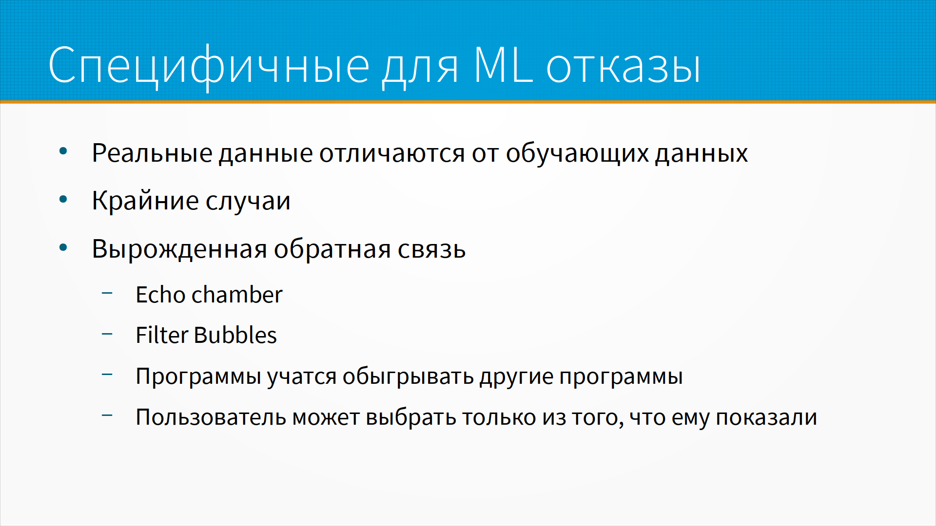 Типичные причины специфичных для ML отказов. Например, реальные данные отличаются от обучающих данных. Например, при обучении мы имели доступ к хорошим пользователям в основном, а на проде к нам пошли плохие заемщики и фродеры.