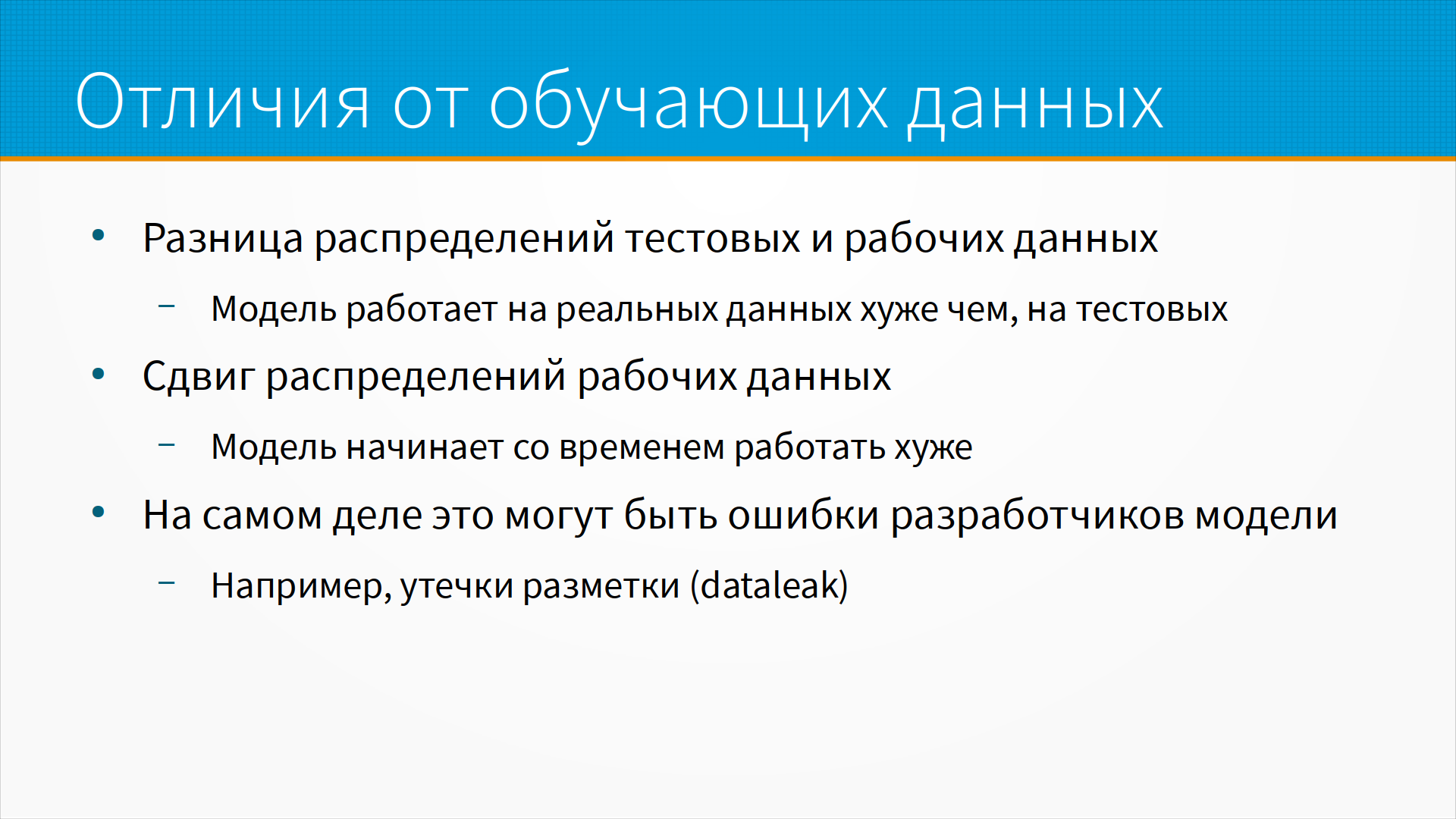 Про отличие обучающих и реальных данных. Часто модель работает на реальных данных хуже, чем на тестовых. Или модель начинает со временем работать хуже. Это обычно говорит о сдвиге распределений. Вообще-то, это не обязательно сдвиг распределений. Это могут быть ошибки при разработке - например, утечки разметки, даталики. Когда вы видите, что ваша модель работает плохо, или у вашей модели на рабочих данных качество хуже, чем на обучающих; когда вы видите, что у вас внезапно откуда-то резко появился сдвиг распределений - возможно, что это просто ошибки разработки.