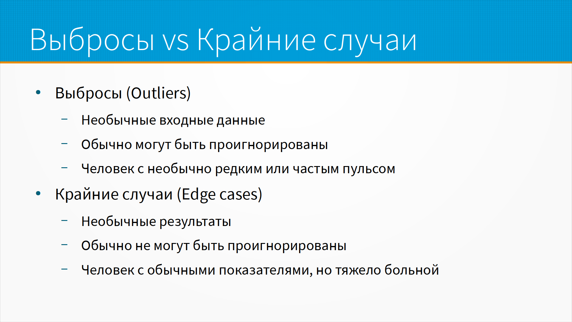И бывают крайние случаи - это необычные результаты, которые не похожи на остальные данные, но их нельзя игнорировать. Например, человек с обычными показателями, с обычным давлением, с обычным пульсом, но с тяжело больным сердцем. И вот тут нам нужно смотреть на то, можем ли мы эти данные выкидывать.