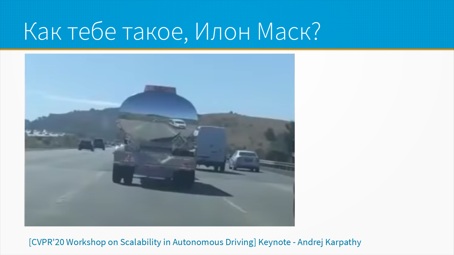 Пример крайнего случая, наверное - это когда автопилот ошибается, потому что глядит на зеркальное отражение дороги в проезжающей цистерне с горючим. То есть на фотографии, на слайде у нас изображена цистерна. Это из доклада Андрея Карпаты про то, как они учили автопилот для Теслы.