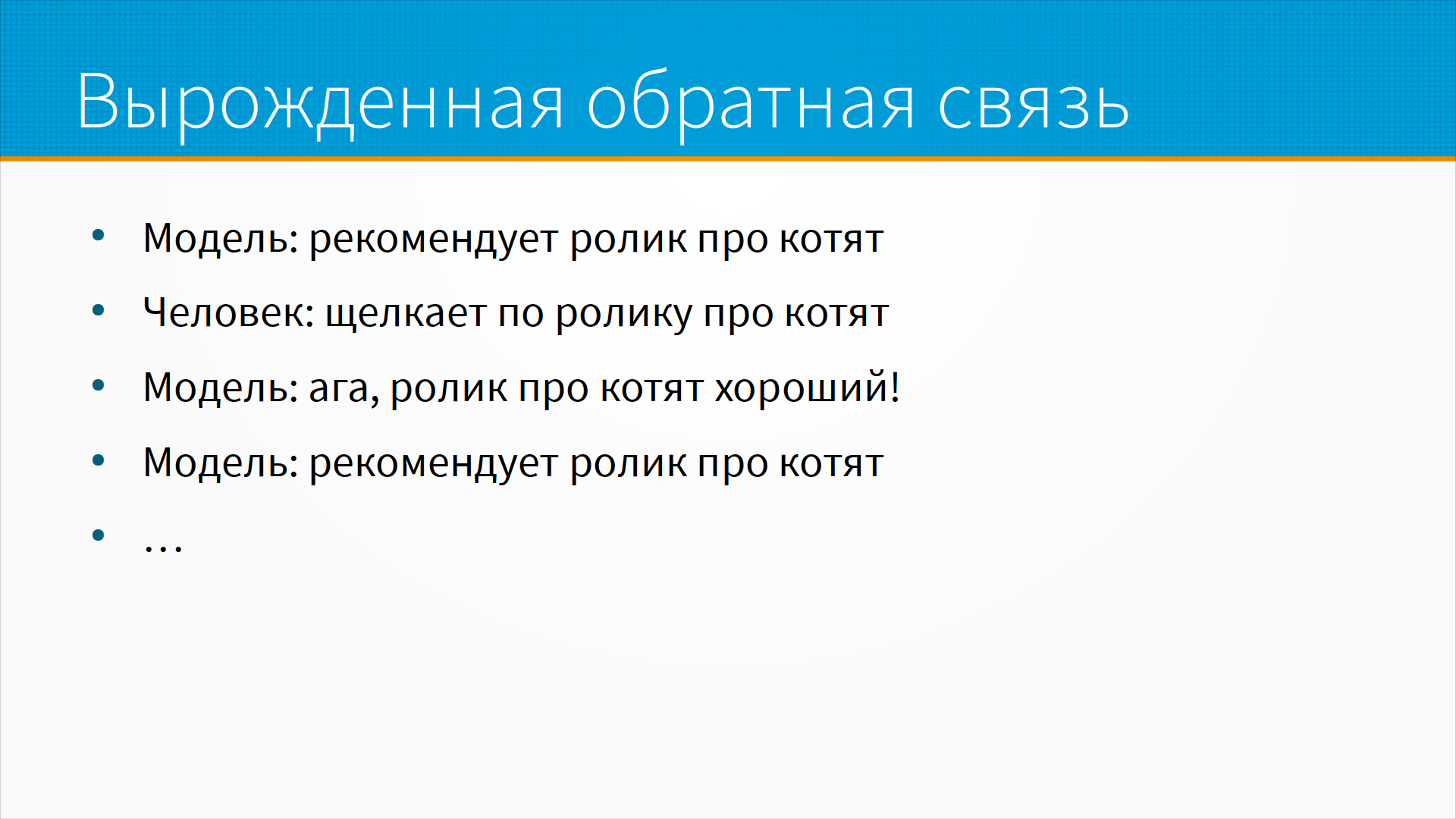 Про выраженную обратную связь мы уже говорили. Это когда вам рекомендуют ролик про котят, вы щелкаете по ролику про котят, модель думает - о, он любит ролики про котят, - и больше ничего, кроме котят, вы не увидите.