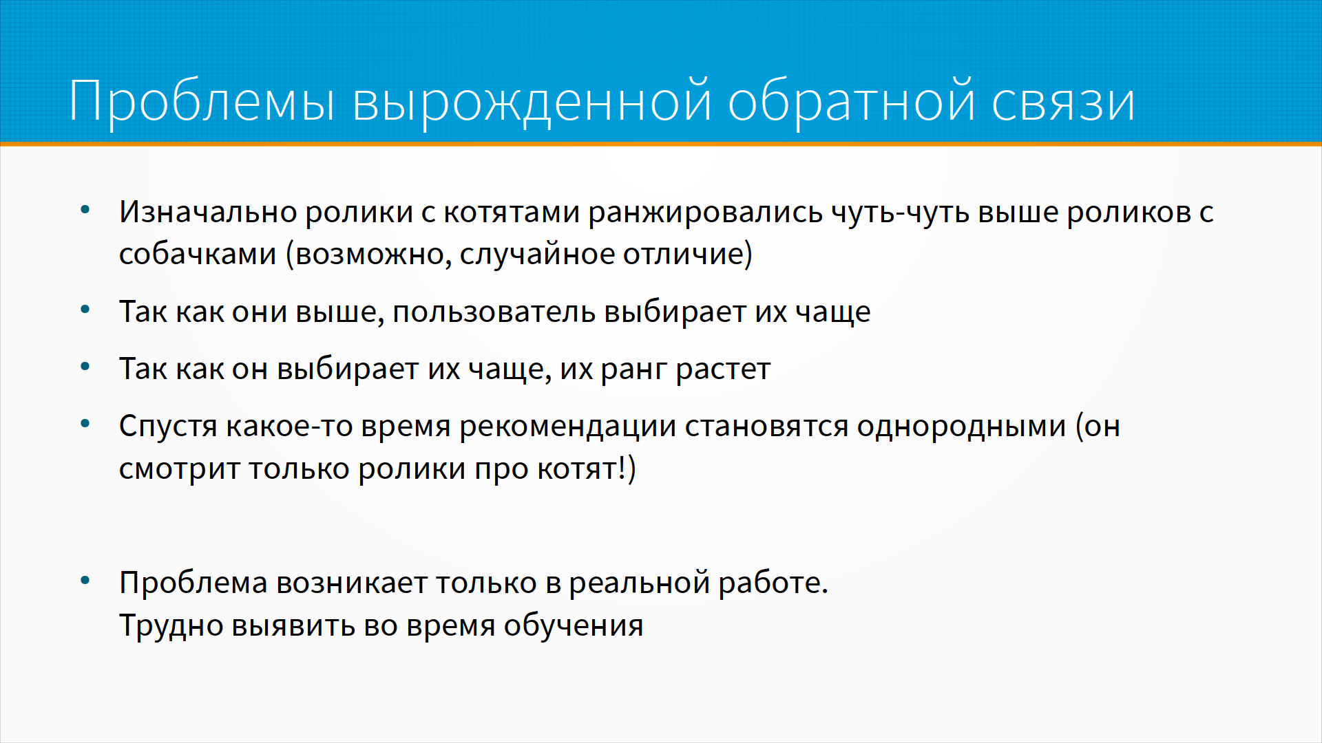 Какие тут есть проблемы? Изначально ролики с котятами, может быть, случайно были чуть выше остальных. Возможно, это был просто шум, но, так как они стояли сверху, вы по ним чаще кликали, а так как вы по ним чаще кликали, модель решила, что они важны. Разница роликов с котятами и роликов с собачками увеличилась, и спустя какое-то время рекомендации становятся однородными. То есть вам не рекомендуют ничего такого, что вы уже не видели.