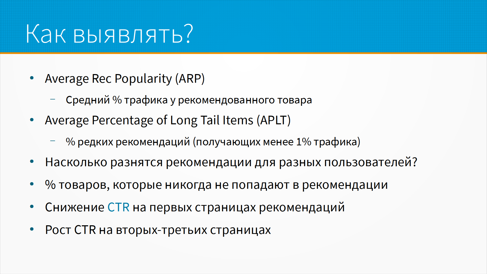 Важно отслеживать процент товаров, которые никогда не попадают в рекомендации. Он может быть шокирующие высок. То есть, я на практике сталкивался с хорошими рекомендательными системами, которые никогда не рекомендуют две трети товаров. То есть, есть где-то треть товаров, которая всегда попадает в рекомендации, а две трети не попадаются никогда. Они, тем не менее, хорошо продают, пользователям нравится, но у нас получается такая большая куча товаров, которые никто никогда не рекомендует, и пользователь их сам не найдет.