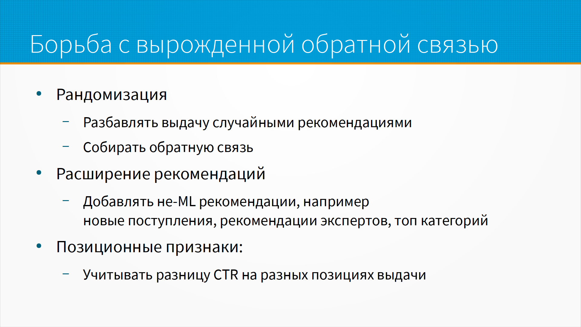 Ситуация вырожденной обратной связи типична для рекомендательных систем. То, что называется echo chamber, эховая комната: когда мы получаем те рекомендации, похожие на те, по которым мы уже кликнули. Соответственно, мы можем кликать только по ним. Дальше нам покажут еще более похожие на нас рекомендации.