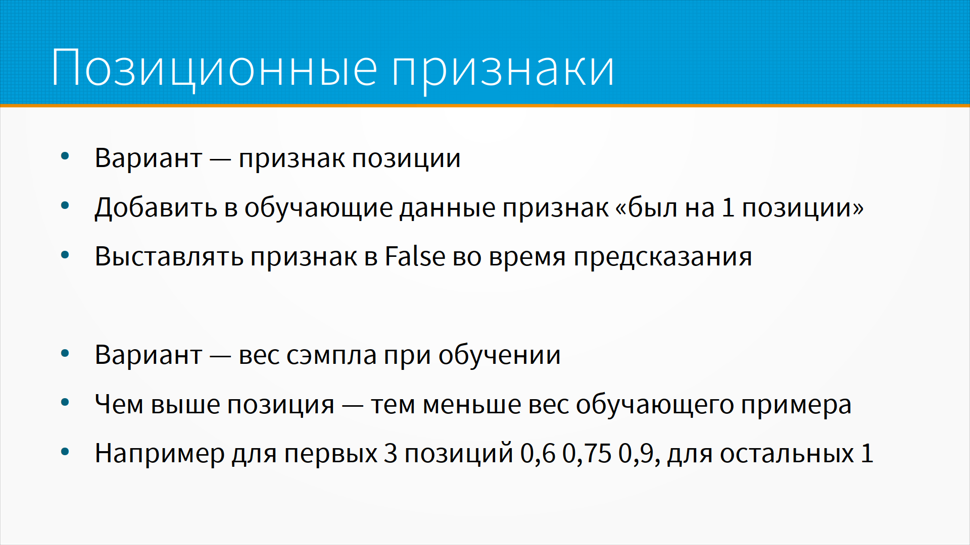 С позиционными признаками есть вариант добавить признак позиции. Просто добавить в обучающие данные признак, была ли эта рекомендация показана на первой странице, когда по ней кликнули. И мы выставляем этот признак всегда в False во время предсказания, чтобы найти те рекомендации, которые бы кликнулись, даже если бы их показали не на первой странице или там внизу, потому что как раз именно это мы и ищем.