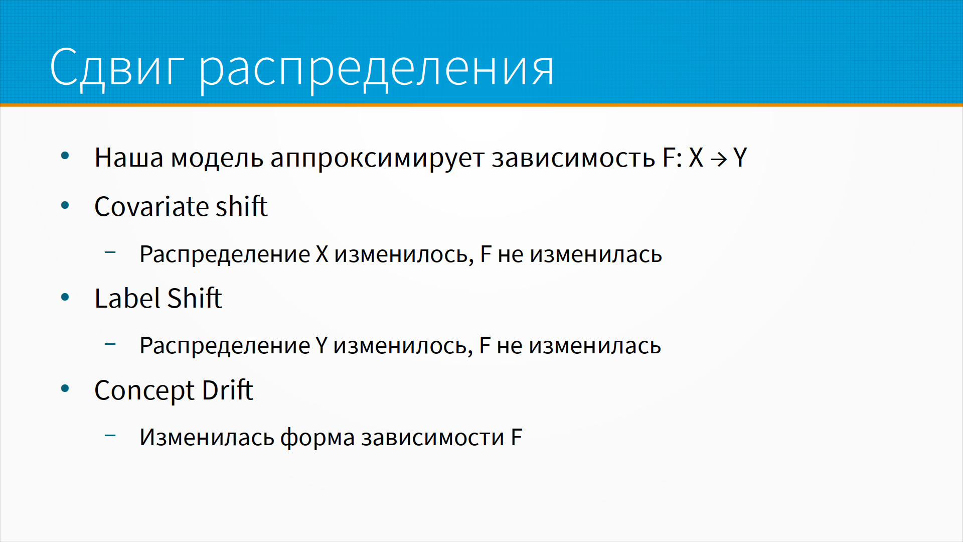 Про сдвиг распределений. Наша модель аппроксимирует некоторую зависимость F от данных, разметки от данных. И мы можем выделять три важных практически разных случая.