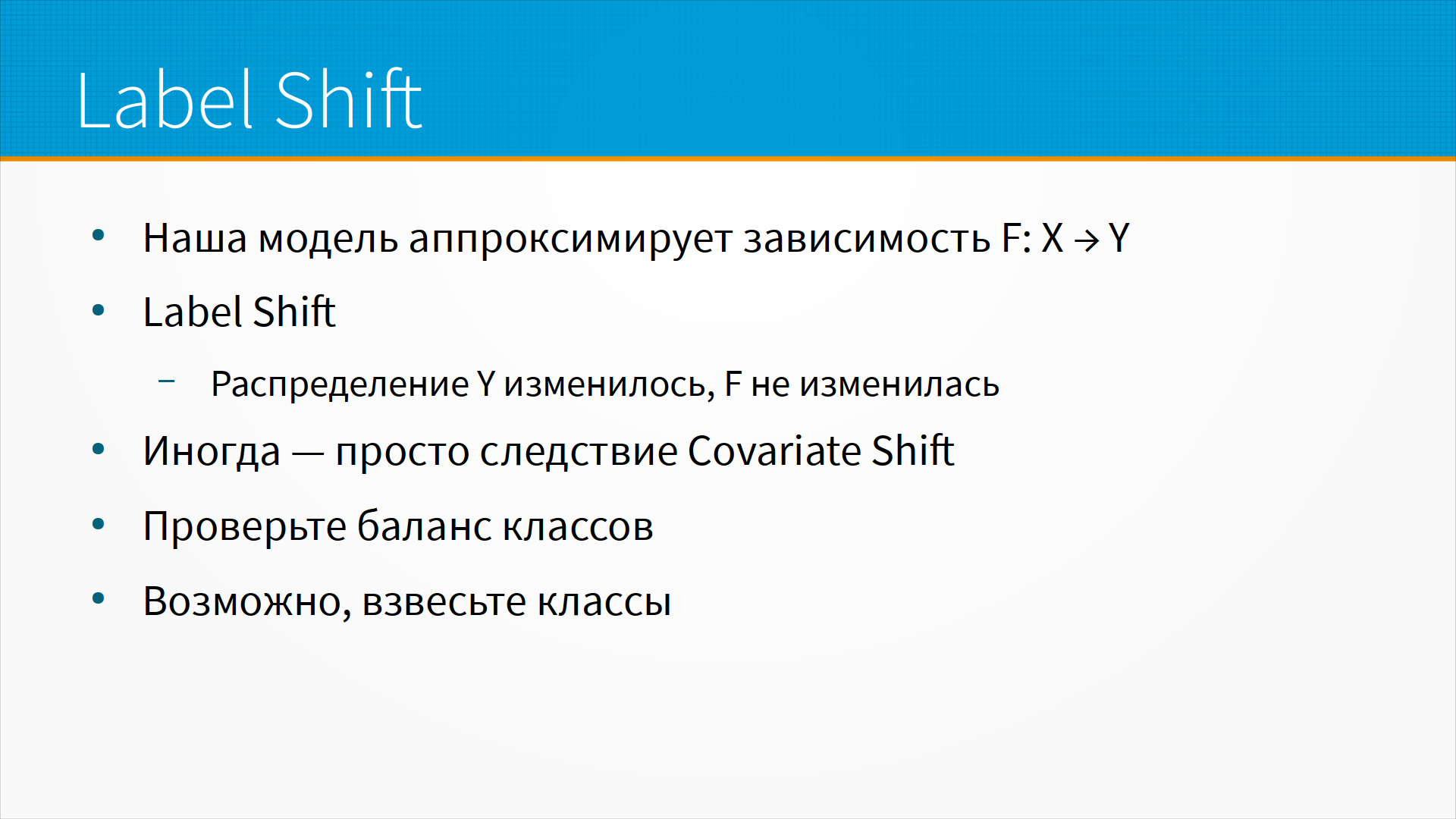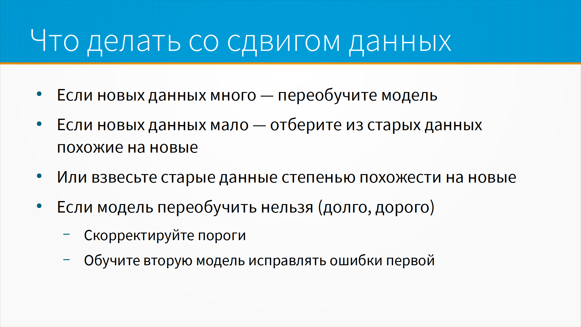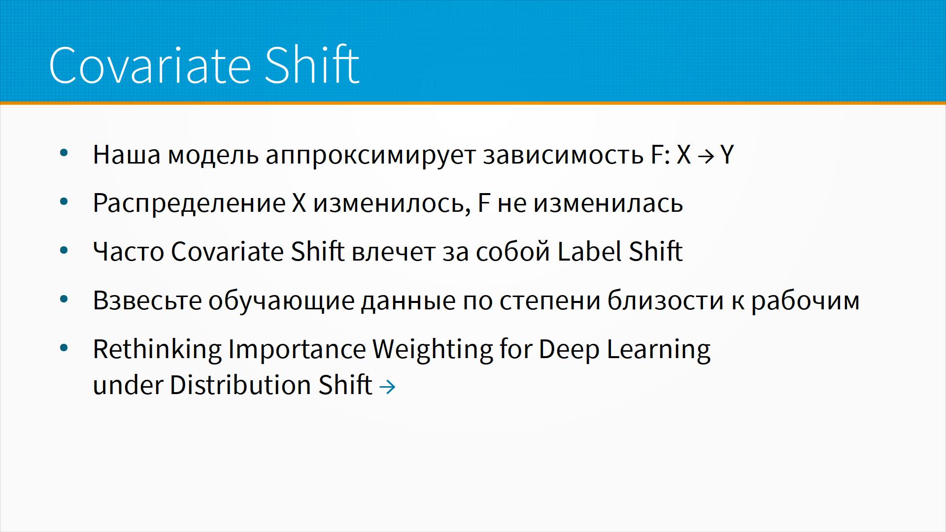 В случае сдвига ковариатов зачастую, если у нас изменилось распределение входных данных, у нас изменится и распределение выходных данных. Хорошо помогает взвесить обучающие данные по степени близости к рабочим. У нас, допустим, когда обучающих данных много, а свежих данных сдвинутых мало, мы можем выкинуть те обучающие данные, которые не похожи на те, что к нам придут сейчас с прода, либо построить некоторую функцию, которая предсказывает - с прода эти данные взятые или это наши старые обучающие данные архивные, и взвесить наши обучающие данные по тому весу, который выдаст эта функция. То есть, грубо говоря, если модель не может отличить наши обучающие данные от наших рабочих, значит, это хорошие обучающие данные. И вот тут есть статья про то, как это делать для нейронки.