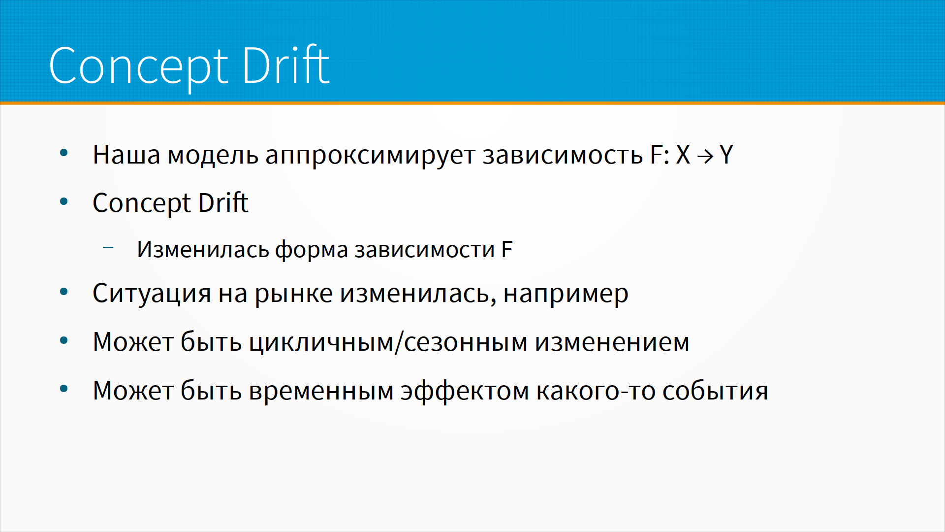 А самая сложная ситуация – это сдвиг концепции, концепт дрифт. Когда изменилась форма зависимости нашей целевой переменной от наших признаков. Например, изменилась ситуация на рынке. Это может быть цикличное сезонное изменение, и его хорошо бы отследить и учитывать. То есть, например, у нас может быть сдвиг, но этот может быть сдвиг, цикличный летом - каждое лето у нас покупатели ведут себя по-летнему, зимой по-зимнему. Либо это может быть временный эффект какого-то события - например, ввели карантин, и себя заемщики стали вести по-другому, а также покупатели в интернет-магазинах.