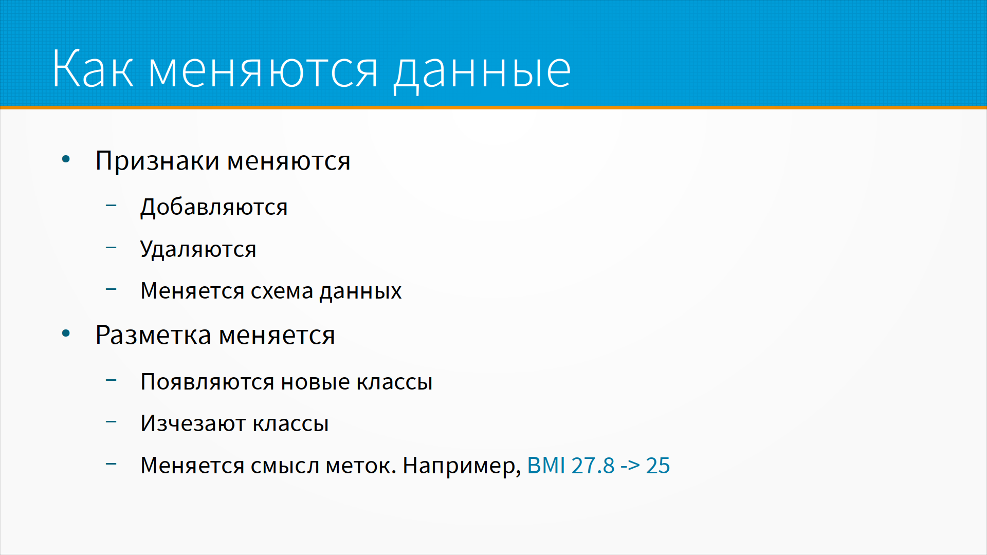 Как, в принципе, меняются данные? Во-первых, меняются признаки. То есть, признаки новые добавляются, удаляются, или меняется сама схема данных. То есть, что-то у нас было строкой, а стало целочисленным признаком. Бывает, что меняется разметка, появляются новые классы, исчезают классы. Или смысл метки может поменяться в одночасье. Например, где-то в конце 90-х, начале 2000-х в Америке резко стало больше людей с ожирением. Но не потому, что они отъелись, хотя этот эффект, конечно, тоже был. А просто потому, что до 99-го года, по-моему, ожирением считался индекс массы тела выше, чем 27,8. Потом стал считаться 25. И все люди с BMI 26 вдруг внезапно из здоровых стали жирными. Поэтому смысл метки может поменяться в одночасье точно так же. Это тоже надо учитывать.