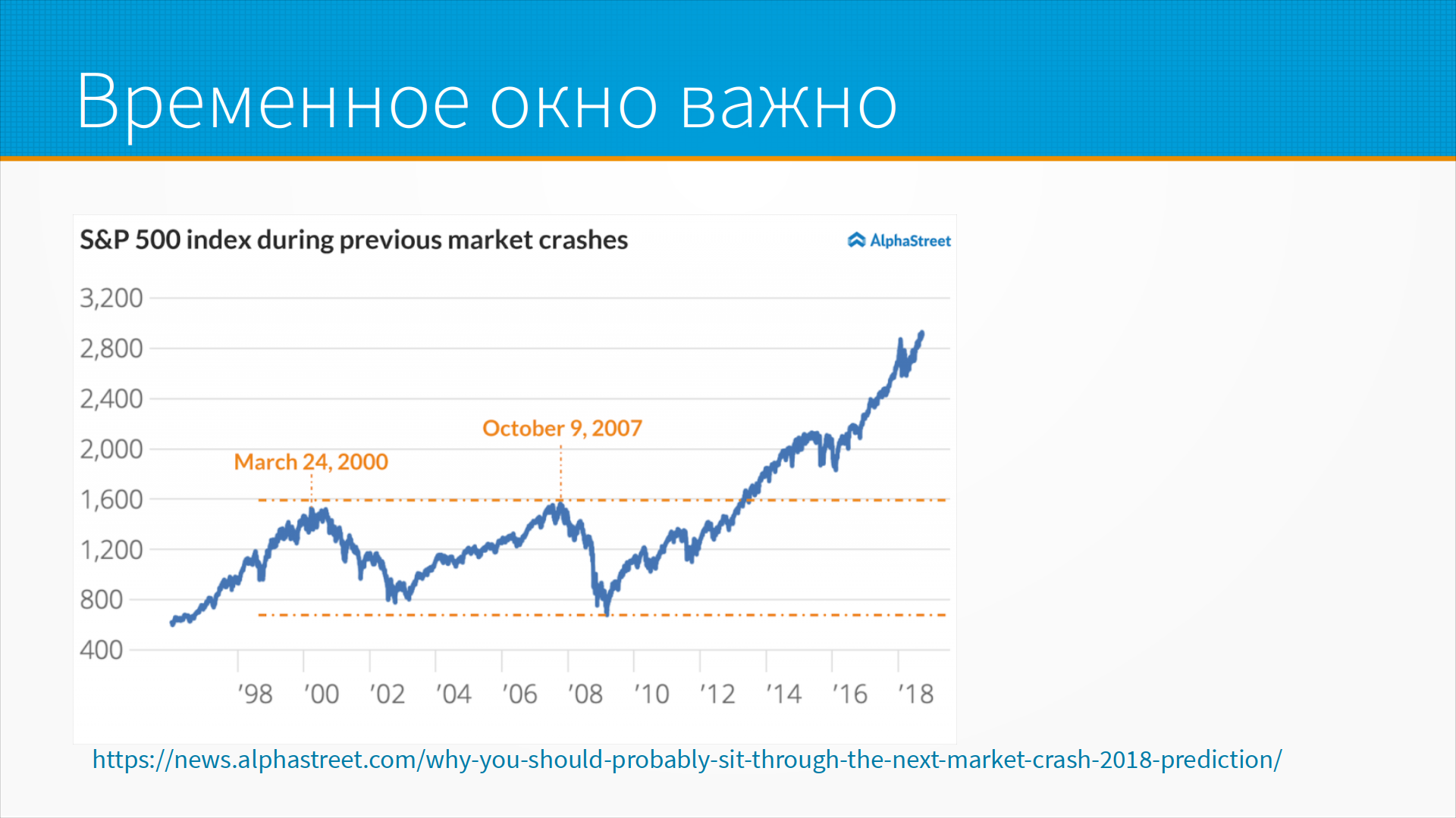 При разметке очень часто важно временное окно, в котором мы смотрим на наши данные. Например, на временной ряд. Мы могли бы сказать, что эта акция растет или падает, но в разных временных горизонтах у нас акция либо растет, либо падает, и это одна и та же самая акция. Вот тут график роста индекса Standard & Poor 500. При этом мы видим, что в зависимости от масштаба мы можем одну и ту же тенденцию считать ростом или падением. Ну и тут график до 18-го года, а потом он резко обрушился. Поэтому временное окно для временных рядов очень важно.