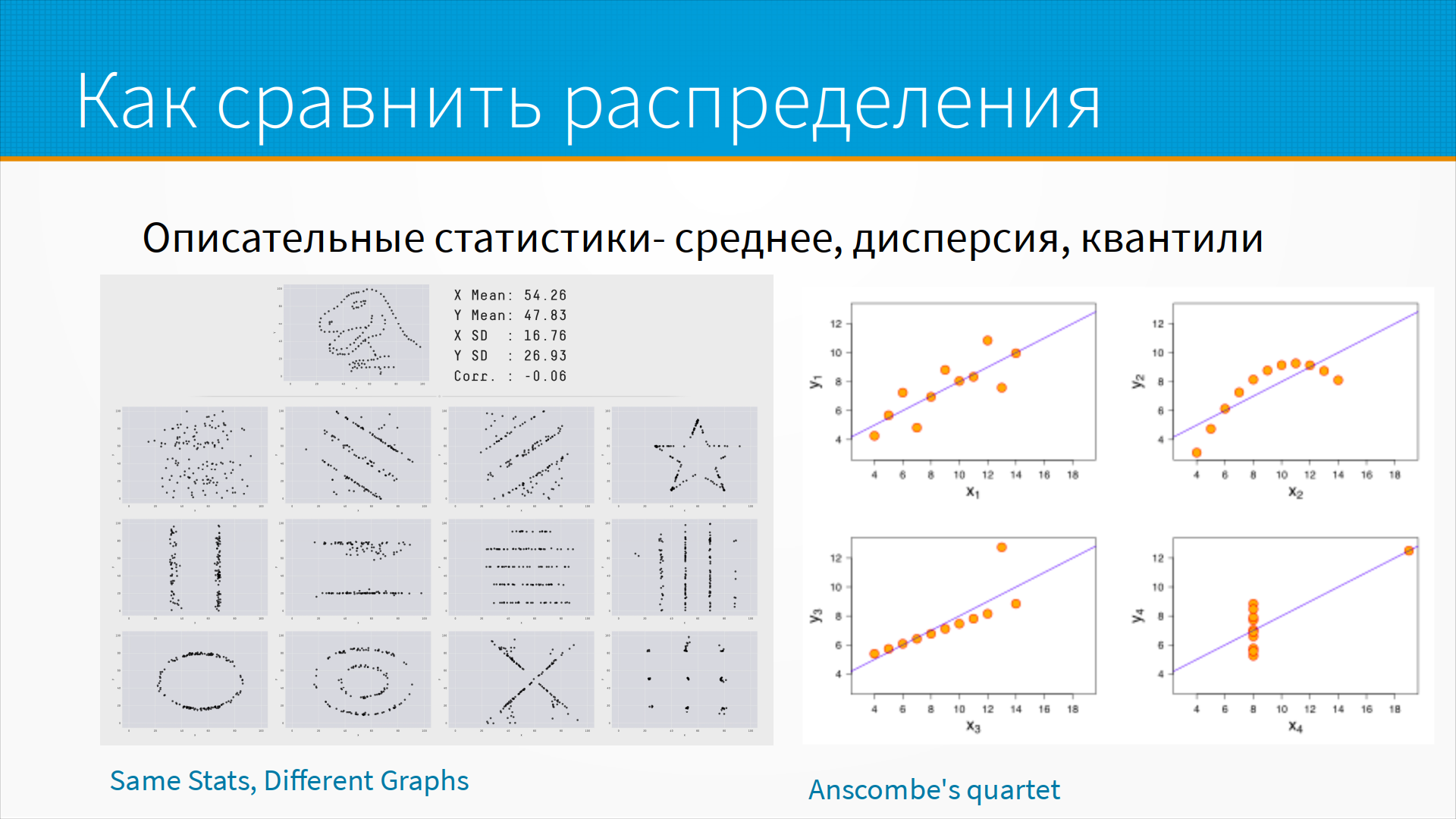 Очень часто данные могут сохранить средние дисперсии, при этом радикально изменить свою картину. Самый известный пример – это квартет Анскомбе, где четыре набора данных с одной и той же корреляцией, одним и тем же средним, при этом они имеют совершенно разную, очевидно, природу.