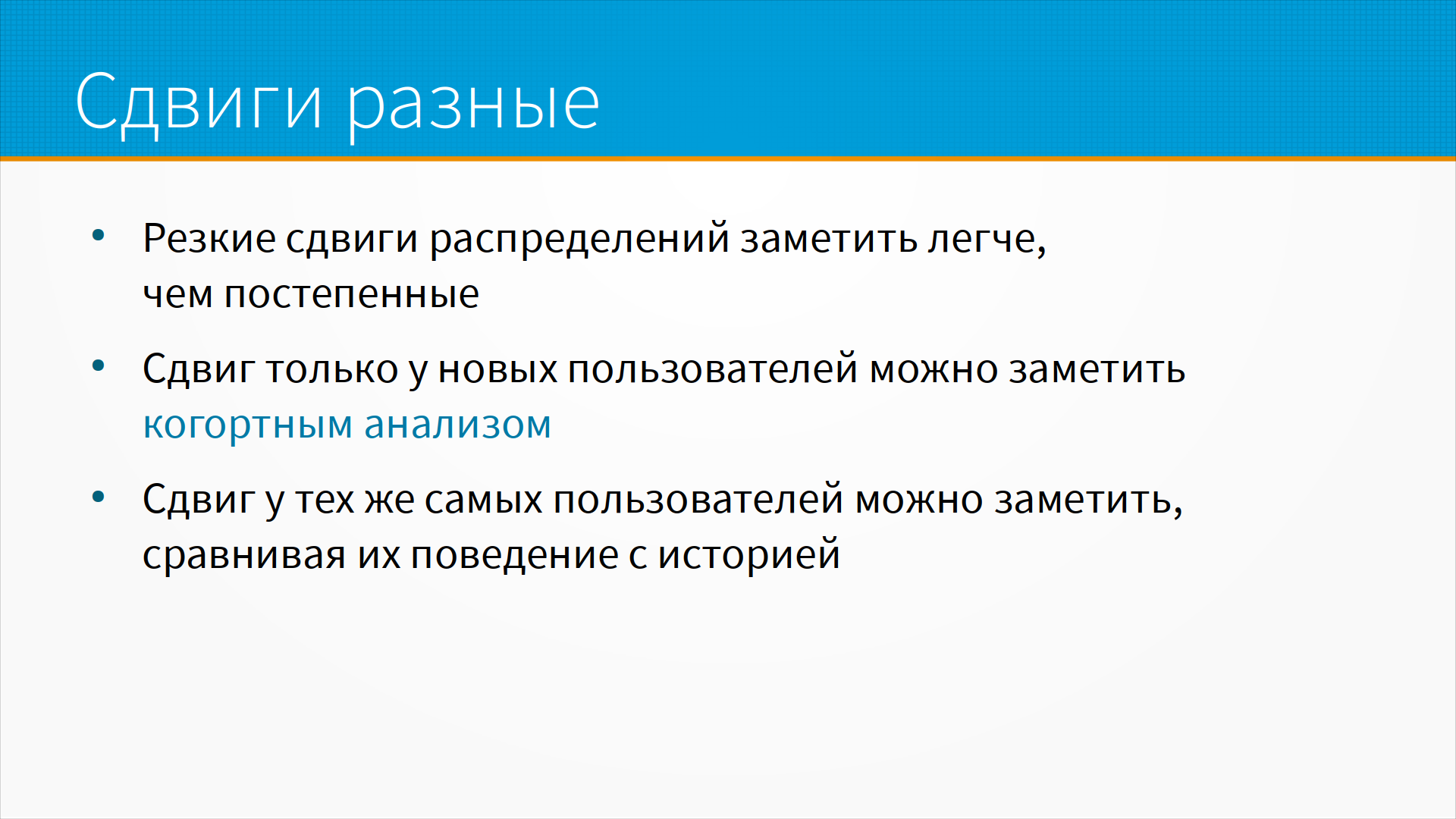 Бывает, что сдвиг есть только у новых пользователей, и тогда хороший способ поймать сдвиг данных - это когортный анализ, когда мы сравниваем статистики не по дням, а по разным группам пользователей. То есть, например, какое качество показывает модель для тех, кто пришёл к нам в январе, в феврале, в марте. И бывает сдвиг у тех же самых пользователей. То есть, например, это те же самые пользователи, которые к нам пришли в январе, но раньше у нас было с ними всё хорошо, а теперь плохо. И сдвиг у тех же самых пользователей мы можем замерить, сравнивая их поведение с нашей зафиксированной историей их поведения, то есть сравнивая текущее поведение с историей поведения.
