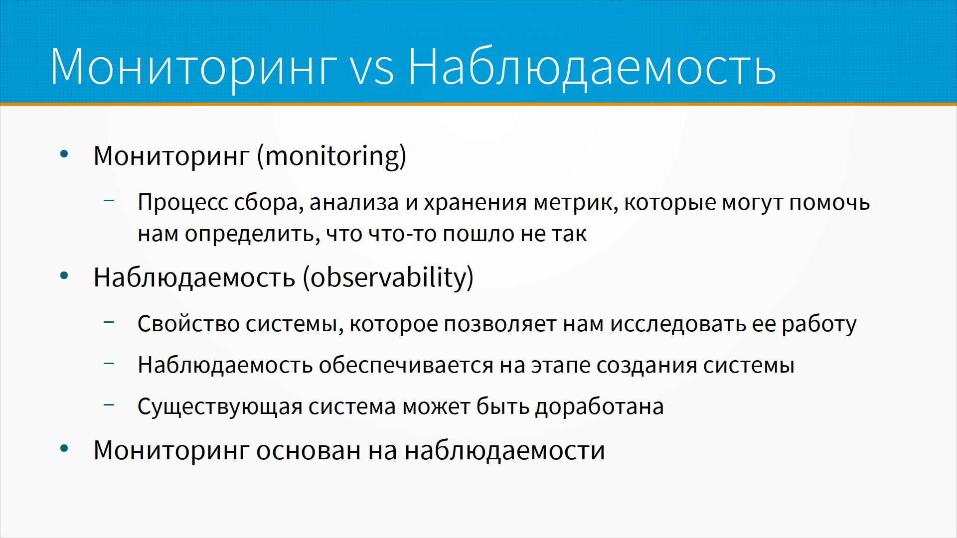 Когда мы говорим о мониторинге, мы говорим обычно о процессе сбора, анализа и хранения метрик для того, чтобы принять решение - пошло что-то не так или все хорошо. Мониторинг опирается на наблюдаемость, observability, системы. Observability - это свойство системы, которое позволяет смотреть, исследовать ее работу. И вот наблюдаемость должна закладываться на этапе создания системы. Мы, конечно, можем взять текущую систему и инструментировать ее, как это говорят, для того, чтобы она собирала нужные нам метрики. На самом-то деле, основы мониторинга мы закладываем, когда разрабатываем систему. Нам нужно сразу во время разработки системы думать, как мы за ней будем следить, как мы будем ее мониторить.
