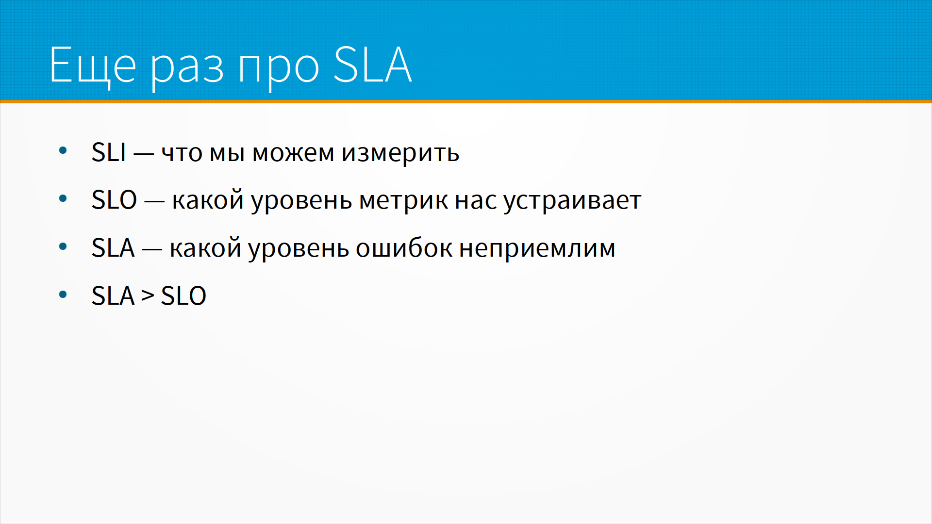 Про SLA мы уже говорили, то есть нам нужно понять, что мы можем измерить, какой уровень метрик нас устраивает, и какой уровень ошибок нам неприемлем. И заложить достаточно большую границу между SLA и SLO, чтобы у нас было пространство для маневра. То есть, грубо говоря, чтобы мы успели исправить нашу ошибку до того, как нас потащат в суд.