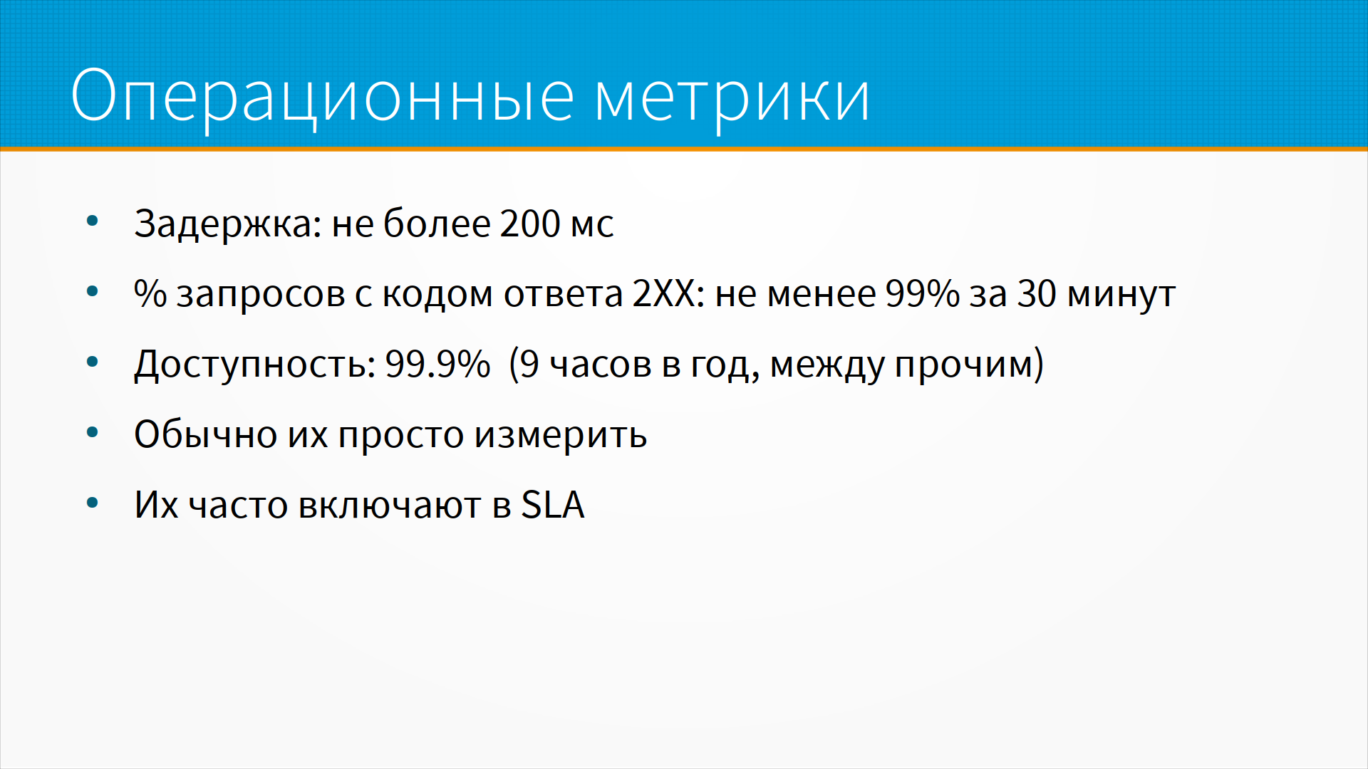 Например, задержка не более 200 миллисекунд. Что такое задержка не более 200 миллисекунд? Обычно это некоторая средняя задержка в течение 5 минут, чтобы 95% запросов отрабатывали не более, чем за 200 миллисекунд. То есть, это не каждый запрос, который отработал в 200 миллисекунд, это мы обычно строим какую-то сложную агрегированную метрику. Или, например, процент запросов с кодом ответа 200 - не менее 99% за 30 минут. Или там, например, доступность 3 девятки - это означает, что у нас целый рабочий день система будет лежать. Их трудно сформулировать, но просто измерить. И их обычно всегда включают в SLA, Service Level Agreement.