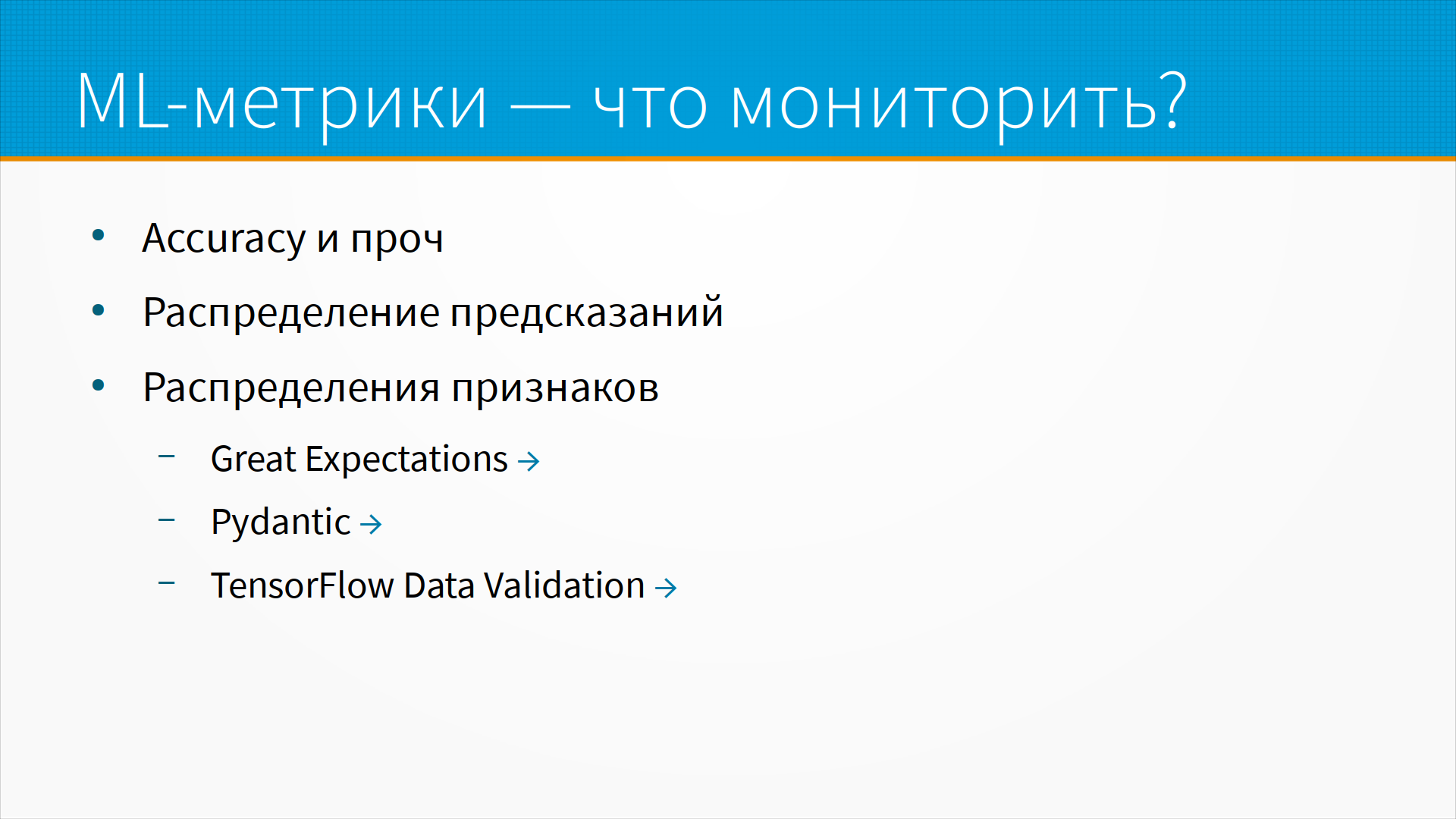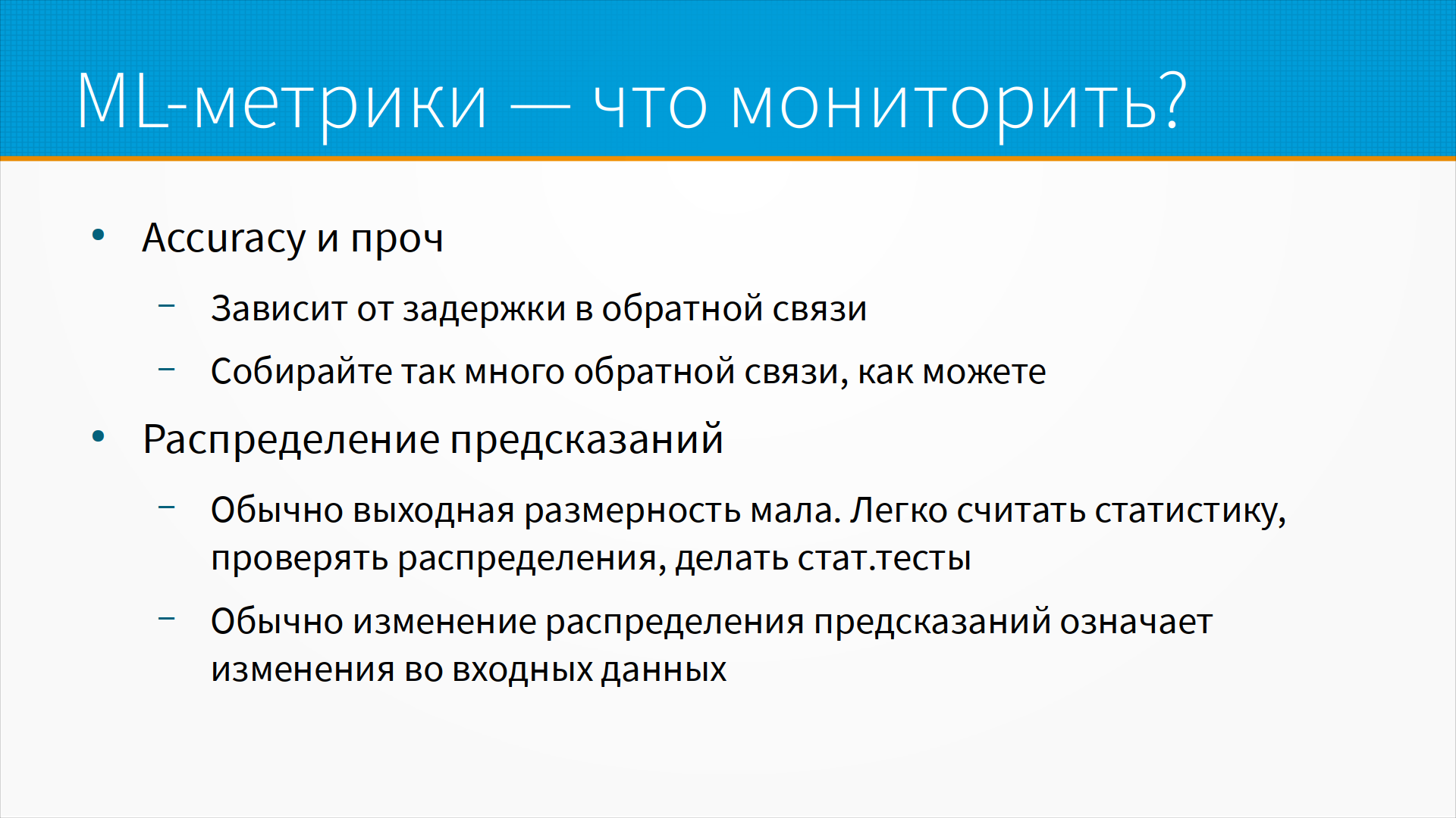 У ML-метрик мы можем собирать метрики с входных распределений и с выходных. Если у вас ресурсы ограничены, мониторьте выходные распределения. Распределение выходных меток, то есть предсказаний, обычно малоразмерное. То есть мы предсказываем одну, две, три переменные. Там легко считать статистику, проверять распределение, делать стат-тесты. И обычно, если у вас изменилось распределение предиктов, скорее всего, что-то поменялось во входных данных. Поэтому, если ресурсы ограничены, то мониторьте распределение ваших предиктов.