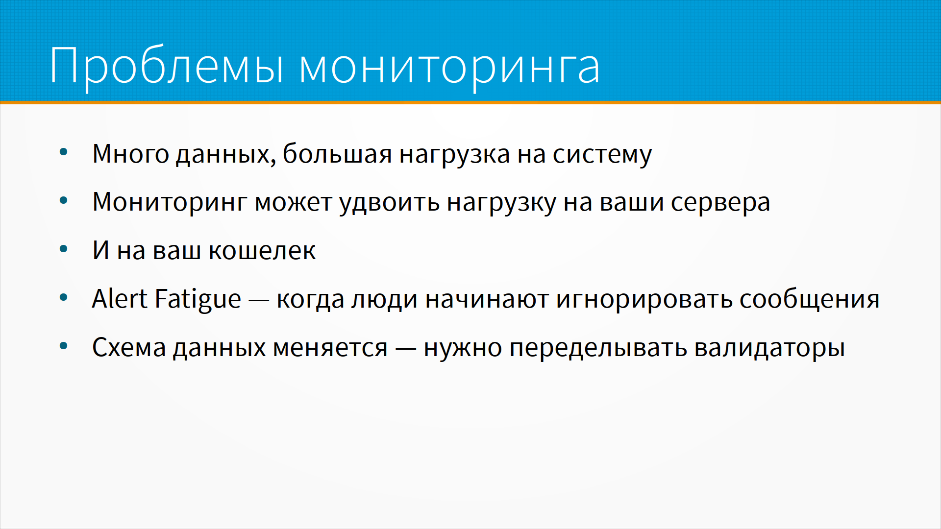 С проблемами мониторинга. Главная проблема мониторинга - это то, что нам приходится обрабатывать много данных. Зачастую сами системы мониторинга съедают в два или в три раза больше процессорной мощности, чем непосредственно модель, которую они мониторят. И вам за это приходится платить - вам нужно будет развертывать ваши сервера, которые все это дело мониторят. Если у вас много мониторинга, у вас много сообщений, возникает так называемая alert fatigue, когда люди начинают игнорировать сообщения из системы мониторинга. Система данных меняется, и вам внезапно приходится переделывать не только модель, но и все валидаторы. Это та ситуация, когда сама по себе разработка и дообучение модели замедляется тем, что вам нужно переделывать не только модель, но и систему мониторинга.