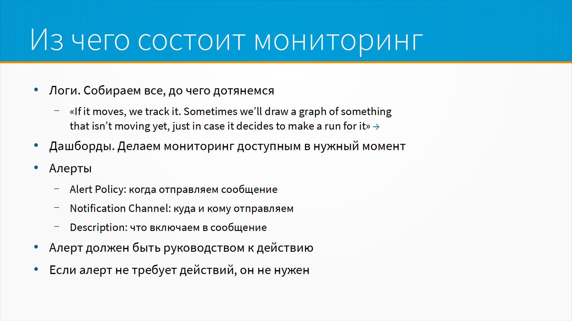 И хорошее правило – алерт всегда должен быть руководством к действию. Если вы сгенерировали алерт, который можно без вреда для системы пропустить и обработать позже, это должен быть не алерт, это должно быть сообщение на дашборде. Если алерт не требует действий, он не нужен.
