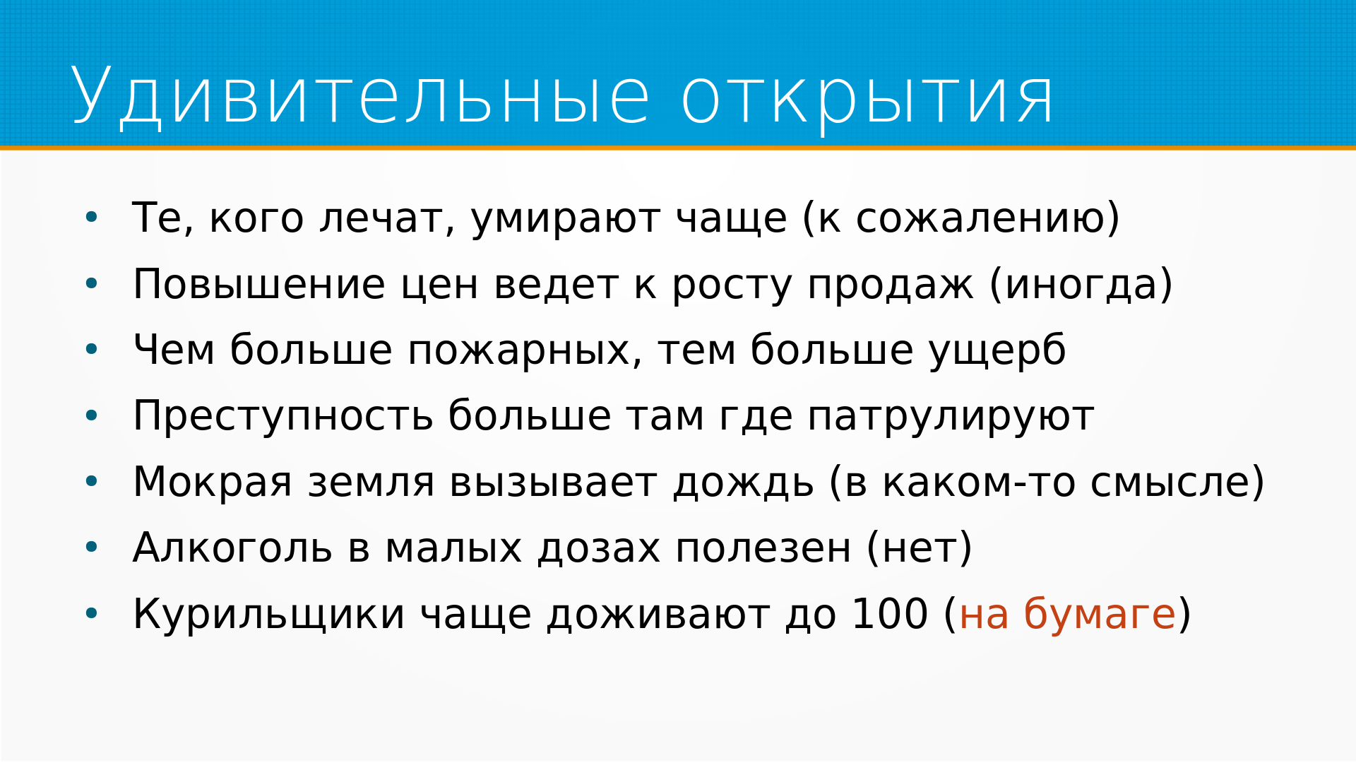 Что итоге хочется сказать - мы даже не начали еще изучать causal inference. То есть хотелось на этих примерах просто задать общий язык, на котором можно будет говорить, потому что есть подход, которым пользуются в классической эконометрике - то есть сначала вам дают много математики, а потом вы ее собираете в кучу. Этот подход хорош, но у него есть проблема, что если математика вам в голову не попала, то дальше вам уже не интересно. Хочется сделать наоборот. Хочется показать примеры, а потом немножко, пока вы зазевались, подсунуть математику.