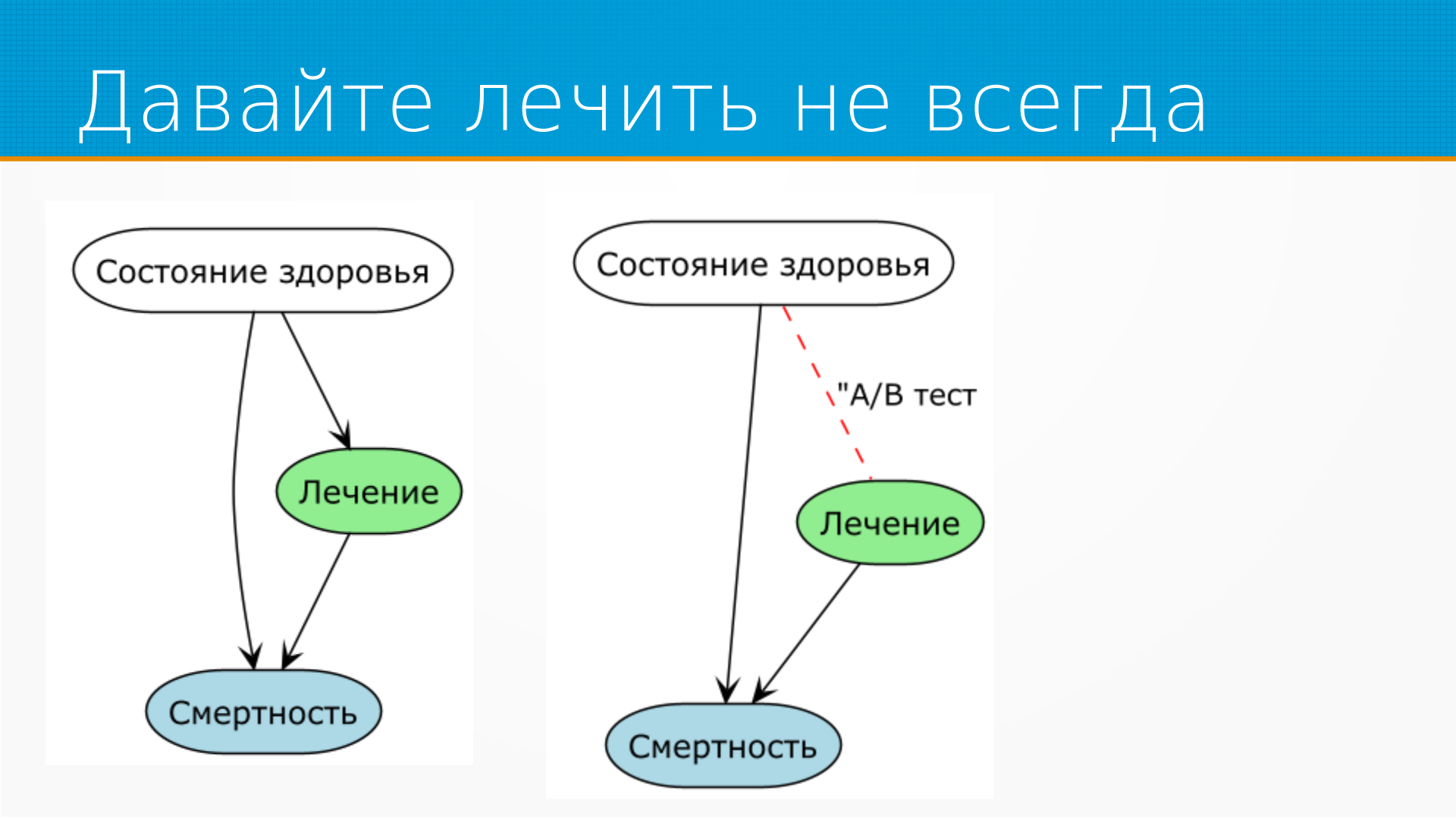 Ну, действительно, те, кого лечат, умирают чаще, но мы знаем, что назначенное лечение зависит от здоровья. То есть это граф причинно-следственной связи, который у нас есть в голове.