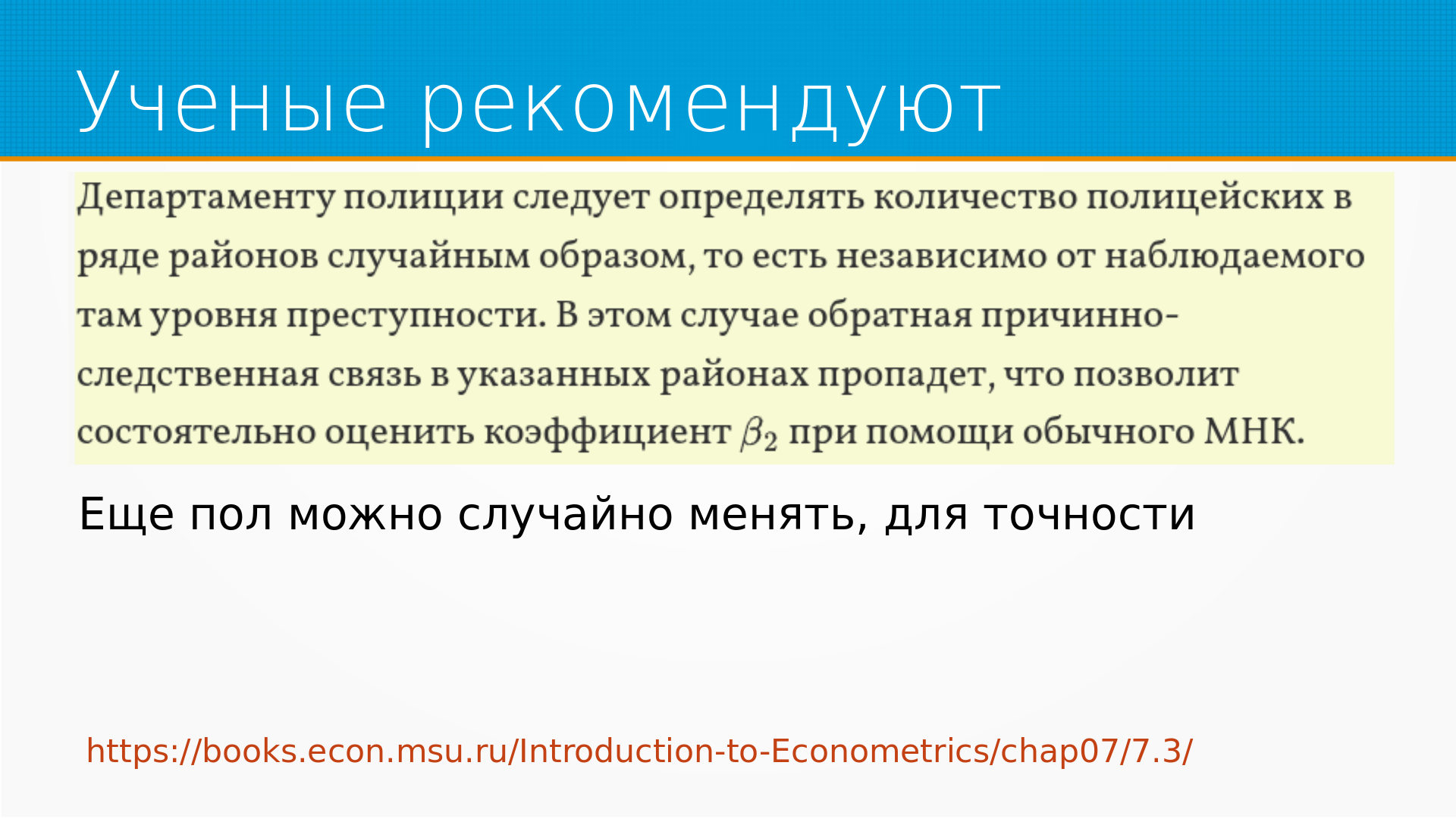 Замечательный пример есть в книжке «Дружелюбная эконометрика», что на самом деле число преступлений и количество патрулей связаны. Патрули появляются на улице потому, что там случаются преступления, и там дается такая клевая рекомендация – случайно отправляйте полицейских в ряд районов, получится АБ-тест, тогда мы хорошо можем получить несмещенную оценку.