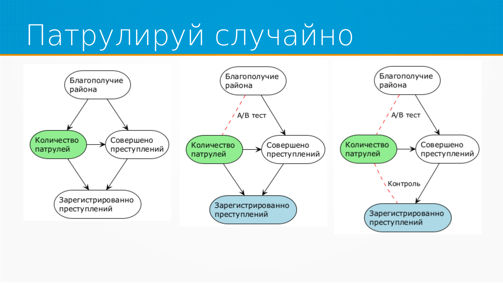 Соответственно, у нас есть кофаундеры - благополучие района и количество зарегистрированных преступлений. Если мы начнем проводить АБ-тесты, просто случайно раскидывая патрули по городу, то мы разрежем эту зависимость между благополучием района и количеством патрулей. То есть АБ-тест, благодаря тому, что мы будем случайно назначать количество патрулей, разрежет эту зависимость, здесь она у меня красным помечена.